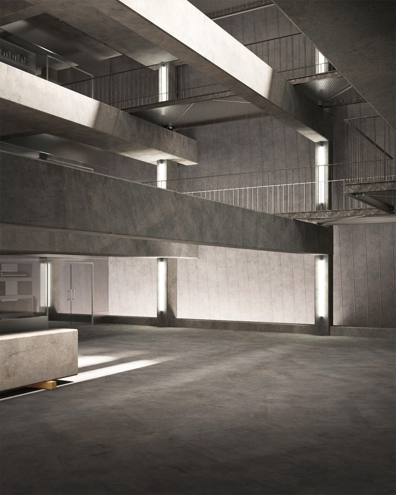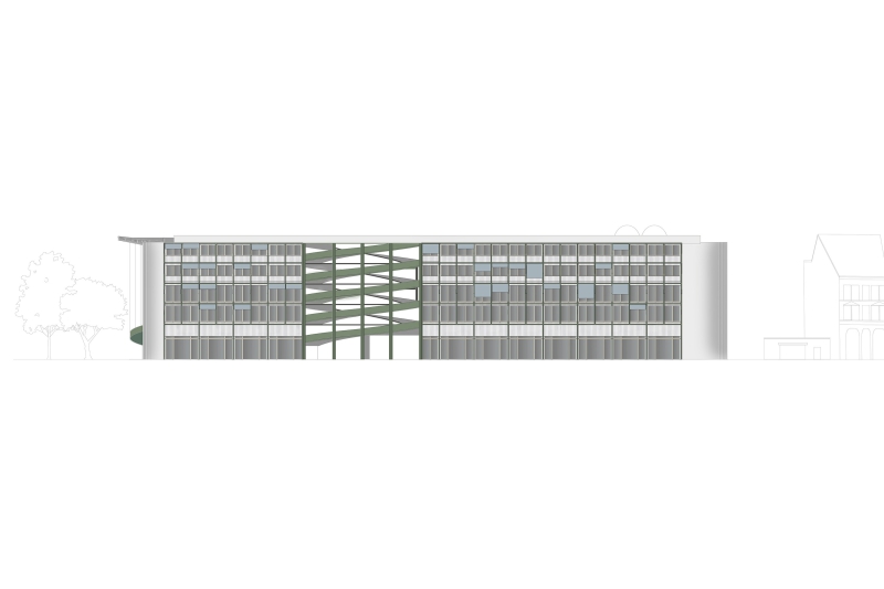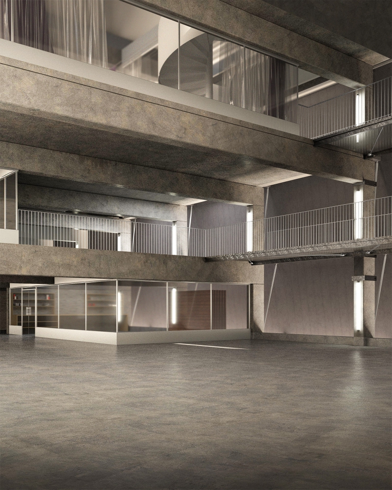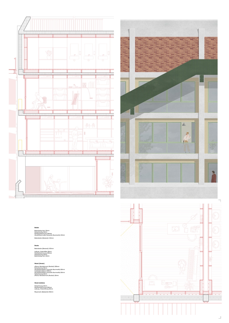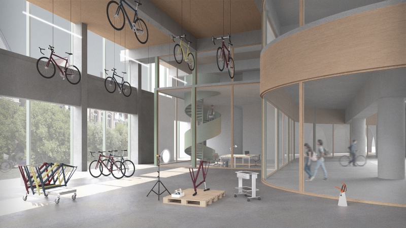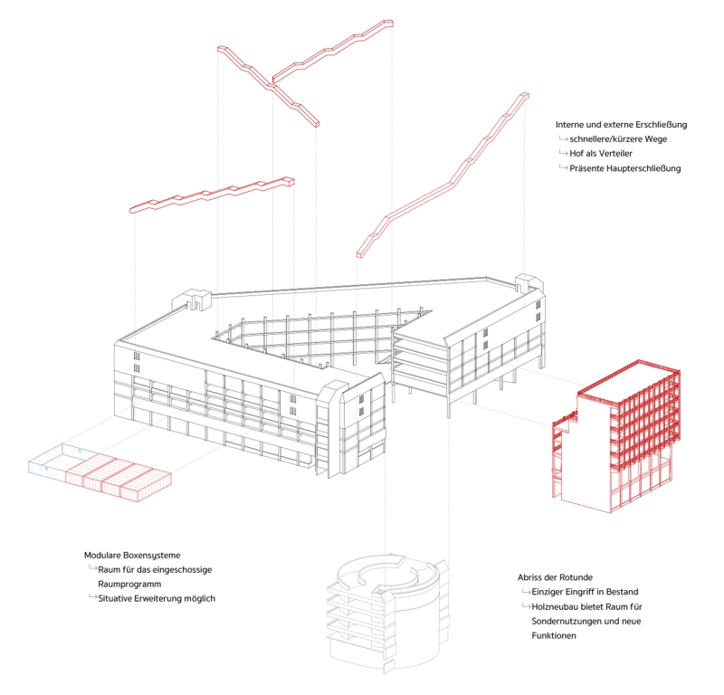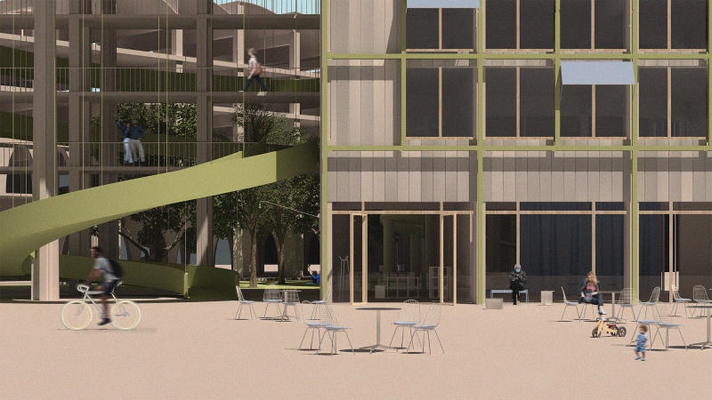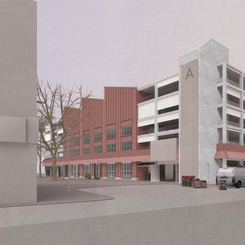 Der KULTUR.RAUM.TRANSFORMATOR ist ein Zusammenschluss verschiedener programmatischer Anforderungen der Stadt Braunschweig sowohl zur Revitalisierung der Innenstadt als auch zur Transformation zur klimaneutralen Gesellschaft. Hier treffen achtsame Ressourcennutzung, Mobilitätswende und Kulturproduktion in einer hybriden Nutzungsmischung aufeinander. Ziel ist es hierdurch auf verschiedene tatsächliche Bedarfe der Stadt Braunschweig einzugehen und eine bauliche Lösung zu finden. Die städtische KULTUR.RAUM.ZENTRALE ist ein zentrales Instrument der kulturellen Stadtentwicklung und wurde bereits 2018 vom Stadtrat beschlossen. Als Koordinierungsstelle fungierend sollen hier Kulturschaffende und Vertreter*innen der Immobilienbranche ein Konzept zur Lösung der innerstädtischen Leerstände erarbeiten können und untereinander vernetzt werden. (Zwischen-)Nutzungen von Leerständen sollen von Kulturprojekten bespielt werden und so den öffentlichen Raum als aktive Stadtgesellschaft wiederbeleben. Während die KULTUR.RAUM.ZENTRALE vorwiegend beratend tätig ist, sollen zusätzliche MAKERSPACES und Fortbildungsprogramme zu Teilhabe, Nachhaltigkeit, und Digitalisierung angeboten werden. Um dem Netzwerk auch in Hinsicht der materiellen Realisierung eine programmatische Entsprechung zu bieten, wird das Programm durch verschiedene Werkstätten und den MATERIALPARK, ein (Gebraucht-)Materiallager, ergänzt. Somit soll eine materialkreislaufgerechte Umsetzung der in der Zentrale vermittelten oder im Transformator entstandenen Visionen ermöglicht werden. Die Parkhausfunktion des Bestandsgebäudes wird im Rahmen des Förderprogramms „Resiliente Innenstädte“ auf eine fahrradorientierte Nutzung angepasst. Hierdurch soll dem stetigen Zuwachs an Fahrradfahrenden und dem damit einhergehenden Bedarf an sicheren innerstädtischen Abstellplätzen Rechnung getragen werden.