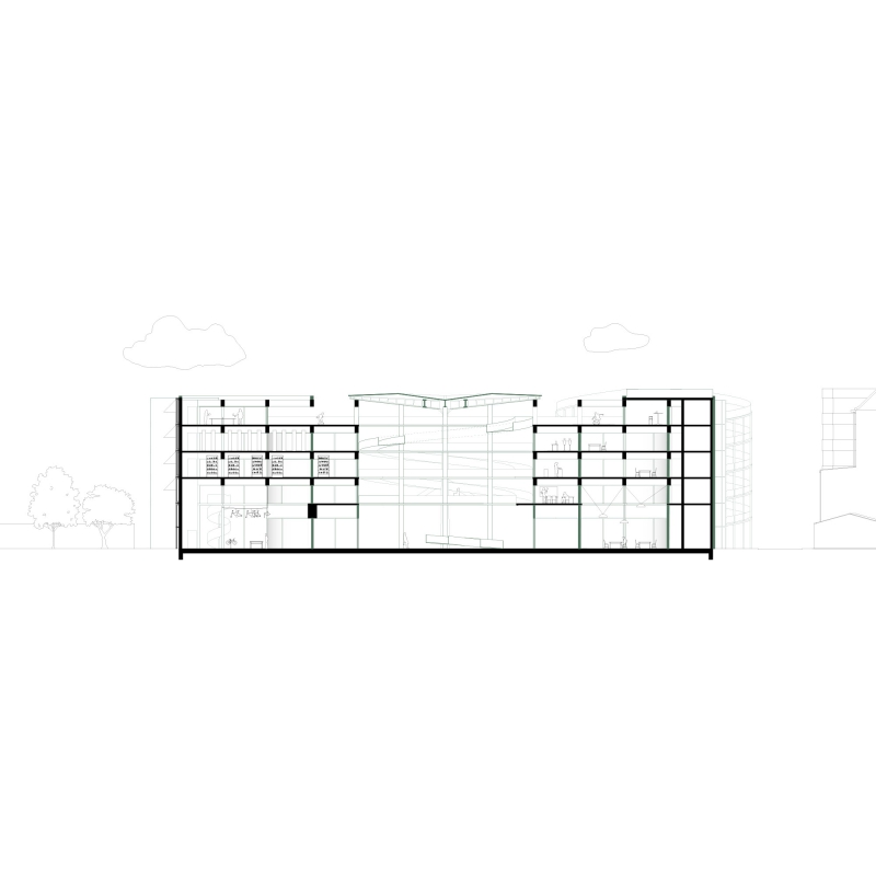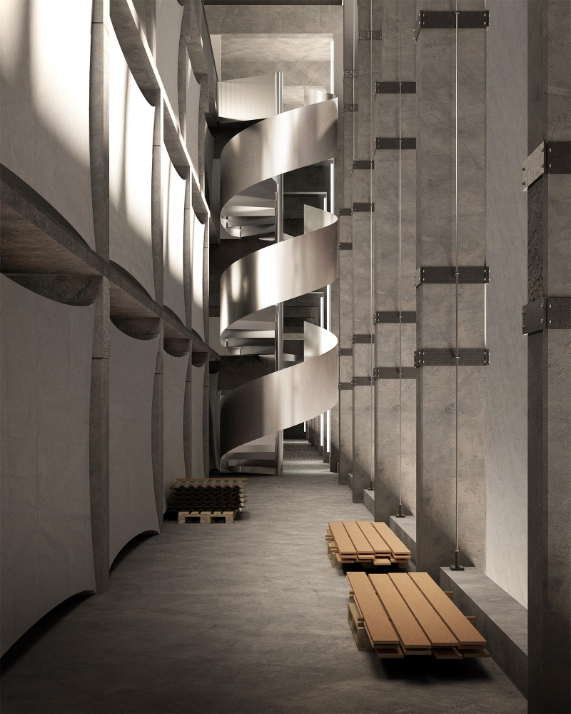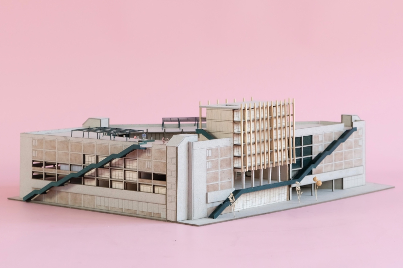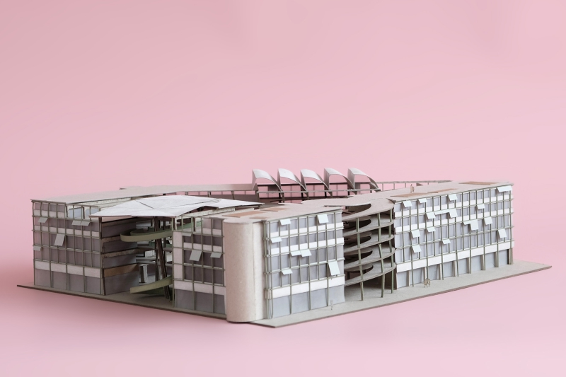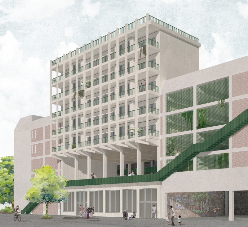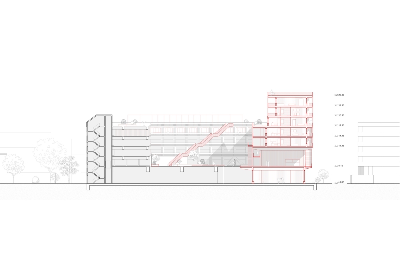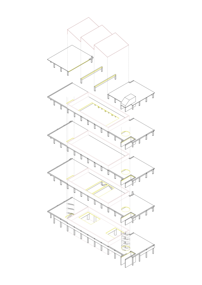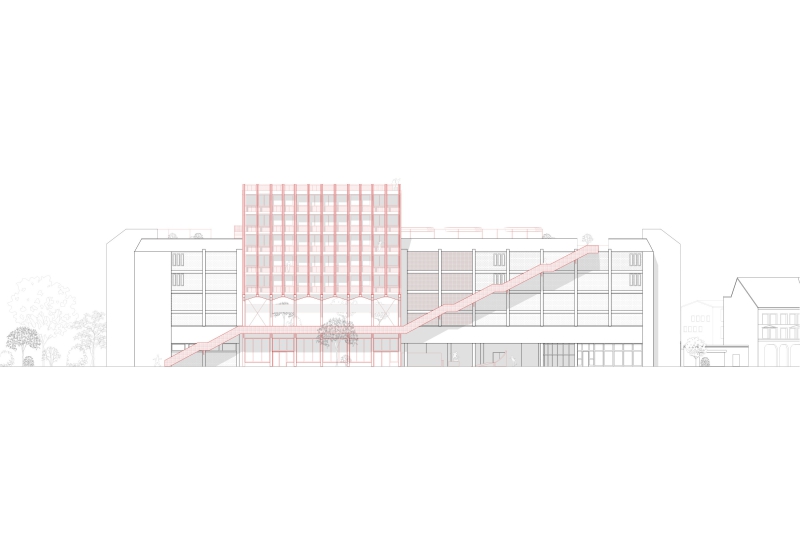 Der KULTUR.RAUM.TRANSFORMATOR ist ein Zusammenschluss verschiedener programmatischer Anforderungen der Stadt Braunschweig sowohl zur Revitalisierung der Innenstadt als auch zur Transformation zur klimaneutralen Gesellschaft. Hier treffen achtsame Ressourcennutzung, Mobilitätswende und Kulturproduktion in einer hybriden Nutzungsmischung aufeinander. Ziel ist es hierdurch auf verschiedene tatsächliche Bedarfe der Stadt Braunschweig einzugehen und eine bauliche Lösung zu finden. Die städtische KULTUR.RAUM.ZENTRALE ist ein zentrales Instrument der kulturellen Stadtentwicklung und wurde bereits 2018 vom Stadtrat beschlossen. Als Koordinierungsstelle fungierend sollen hier Kulturschaffende und Vertreter*innen der Immobilienbranche ein Konzept zur Lösung der innerstädtischen Leerstände erarbeiten können und untereinander vernetzt werden. (Zwischen-)Nutzungen von Leerständen sollen von Kulturprojekten bespielt werden und so den öffentlichen Raum als aktive Stadtgesellschaft wiederbeleben. Während die KULTUR.RAUM.ZENTRALE vorwiegend beratend tätig ist, sollen zusätzliche MAKERSPACES und Fortbildungsprogramme zu Teilhabe, Nachhaltigkeit, und Digitalisierung angeboten werden. Um dem Netzwerk auch in Hinsicht der materiellen Realisierung eine programmatische Entsprechung zu bieten, wird das Programm durch verschiedene Werkstätten und den MATERIALPARK, ein (Gebraucht-)Materiallager, ergänzt. Somit soll eine materialkreislaufgerechte Umsetzung der in der Zentrale vermittelten oder im Transformator entstandenen Visionen ermöglicht werden. Die Parkhausfunktion des Bestandsgebäudes wird im Rahmen des Förderprogramms „Resiliente Innenstädte“ auf eine fahrradorientierte Nutzung angepasst. Hierdurch soll dem stetigen Zuwachs an Fahrradfahrenden und dem damit einhergehenden Bedarf an sicheren innerstädtischen Abstellplätzen Rechnung getragen werden.