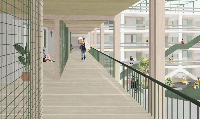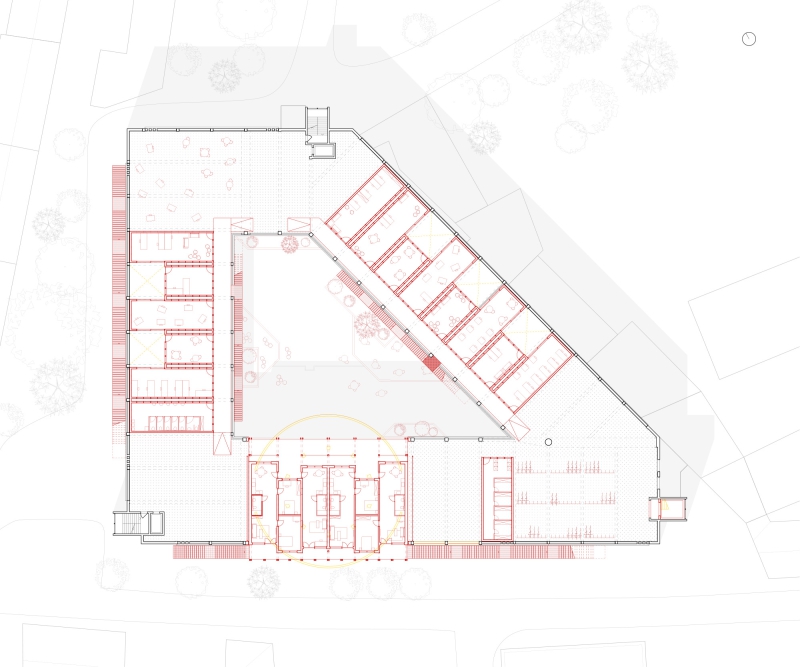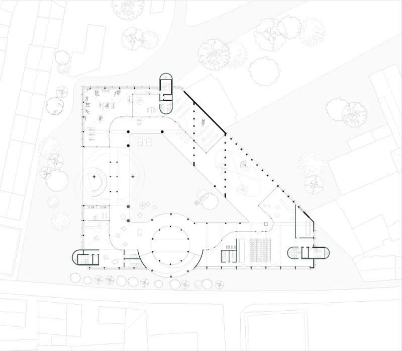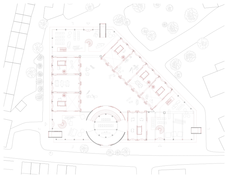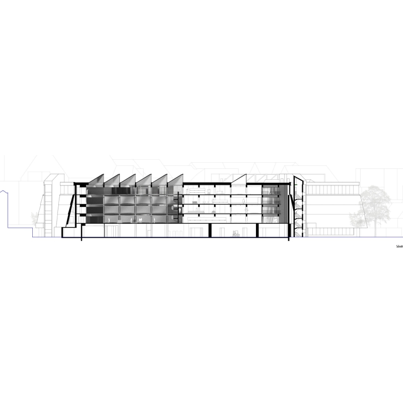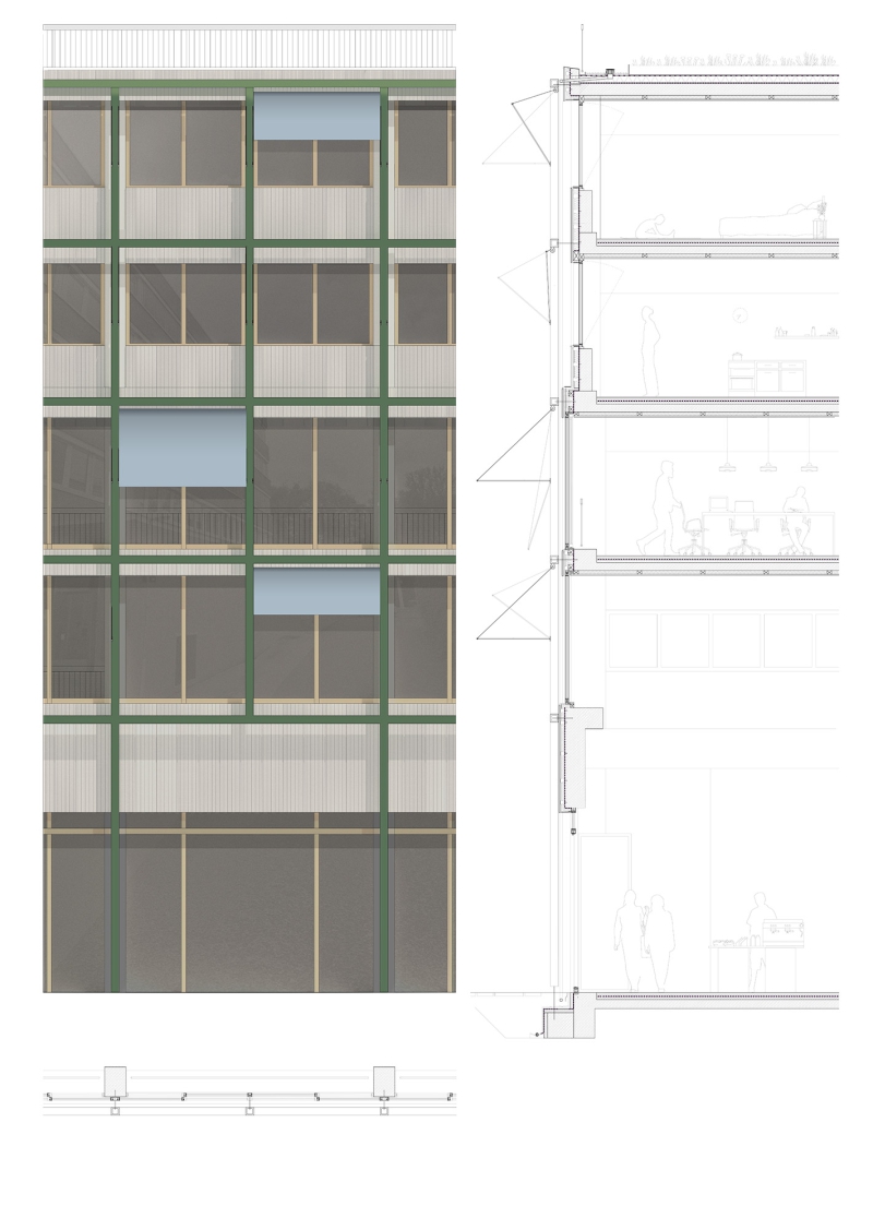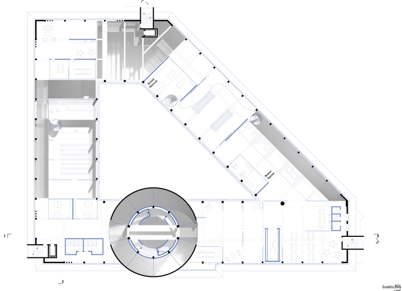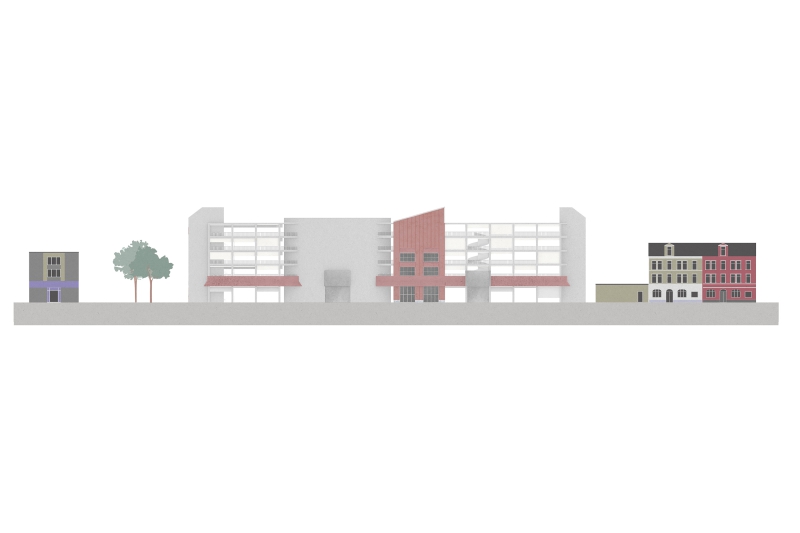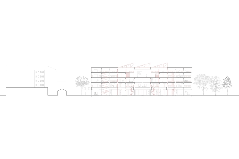 Der KULTUR.RAUM.TRANSFORMATOR ist ein Zusammenschluss verschiedener programmatischer Anforderungen der Stadt Braunschweig sowohl zur Revitalisierung der Innenstadt als auch zur Transformation zur klimaneutralen Gesellschaft. Hier treffen achtsame Ressourcennutzung, Mobilitätswende und Kulturproduktion in einer hybriden Nutzungsmischung aufeinander. Ziel ist es hierdurch auf verschiedene tatsächliche Bedarfe der Stadt Braunschweig einzugehen und eine bauliche Lösung zu finden. Die städtische KULTUR.RAUM.ZENTRALE ist ein zentrales Instrument der kulturellen Stadtentwicklung und wurde bereits 2018 vom Stadtrat beschlossen. Als Koordinierungsstelle fungierend sollen hier Kulturschaffende und Vertreter*innen der Immobilienbranche ein Konzept zur Lösung der innerstädtischen Leerstände erarbeiten können und untereinander vernetzt werden. (Zwischen-)Nutzungen von Leerständen sollen von Kulturprojekten bespielt werden und so den öffentlichen Raum als aktive Stadtgesellschaft wiederbeleben. Während die KULTUR.RAUM.ZENTRALE vorwiegend beratend tätig ist, sollen zusätzliche MAKERSPACES und Fortbildungsprogramme zu Teilhabe, Nachhaltigkeit, und Digitalisierung angeboten werden. Um dem Netzwerk auch in Hinsicht der materiellen Realisierung eine programmatische Entsprechung zu bieten, wird das Programm durch verschiedene Werkstätten und den MATERIALPARK, ein (Gebraucht-)Materiallager, ergänzt. Somit soll eine materialkreislaufgerechte Umsetzung der in der Zentrale vermittelten oder im Transformator entstandenen Visionen ermöglicht werden. Die Parkhausfunktion des Bestandsgebäudes wird im Rahmen des Förderprogramms „Resiliente Innenstädte“ auf eine fahrradorientierte Nutzung angepasst. Hierdurch soll dem stetigen Zuwachs an Fahrradfahrenden und dem damit einhergehenden Bedarf an sicheren innerstädtischen Abstellplätzen Rechnung getragen werden.