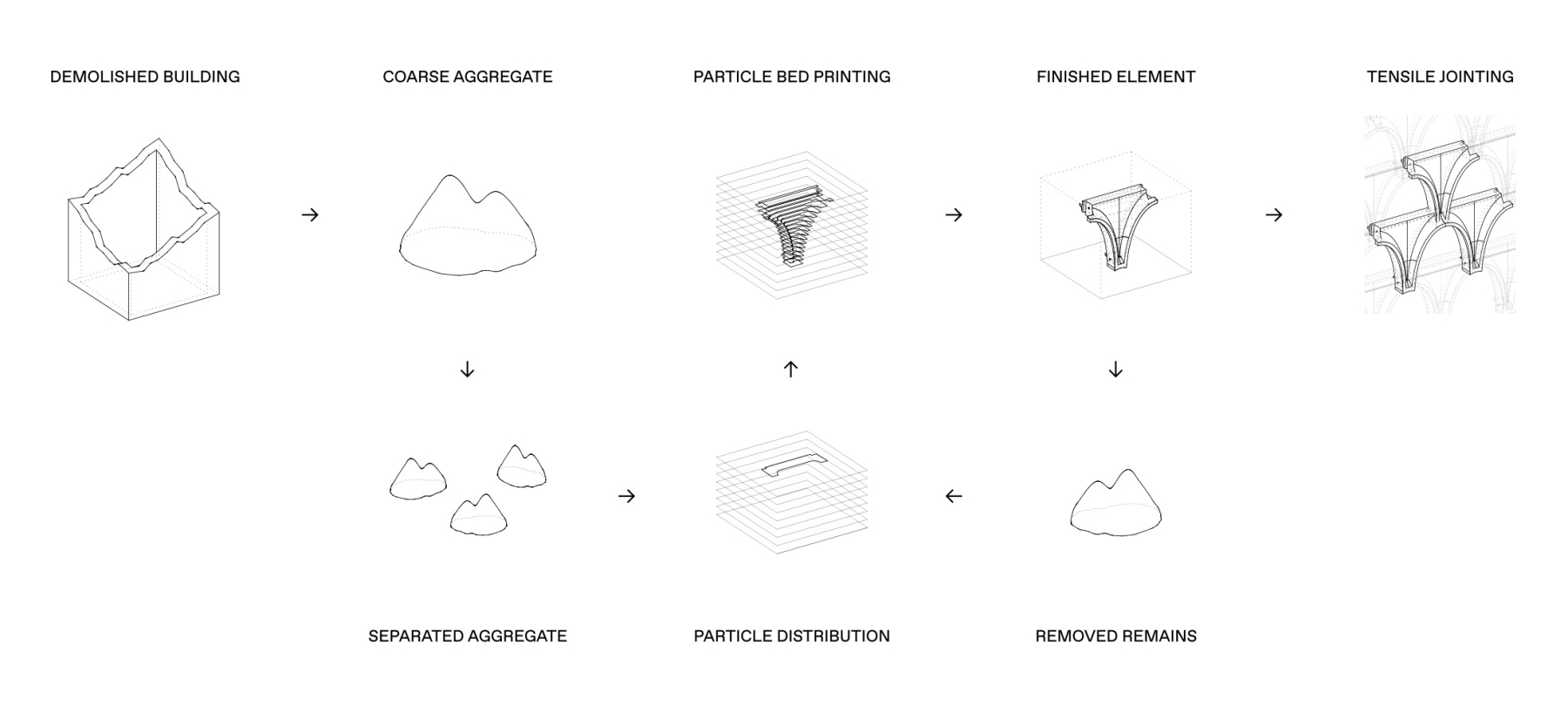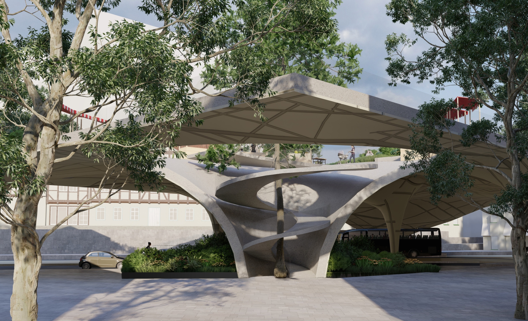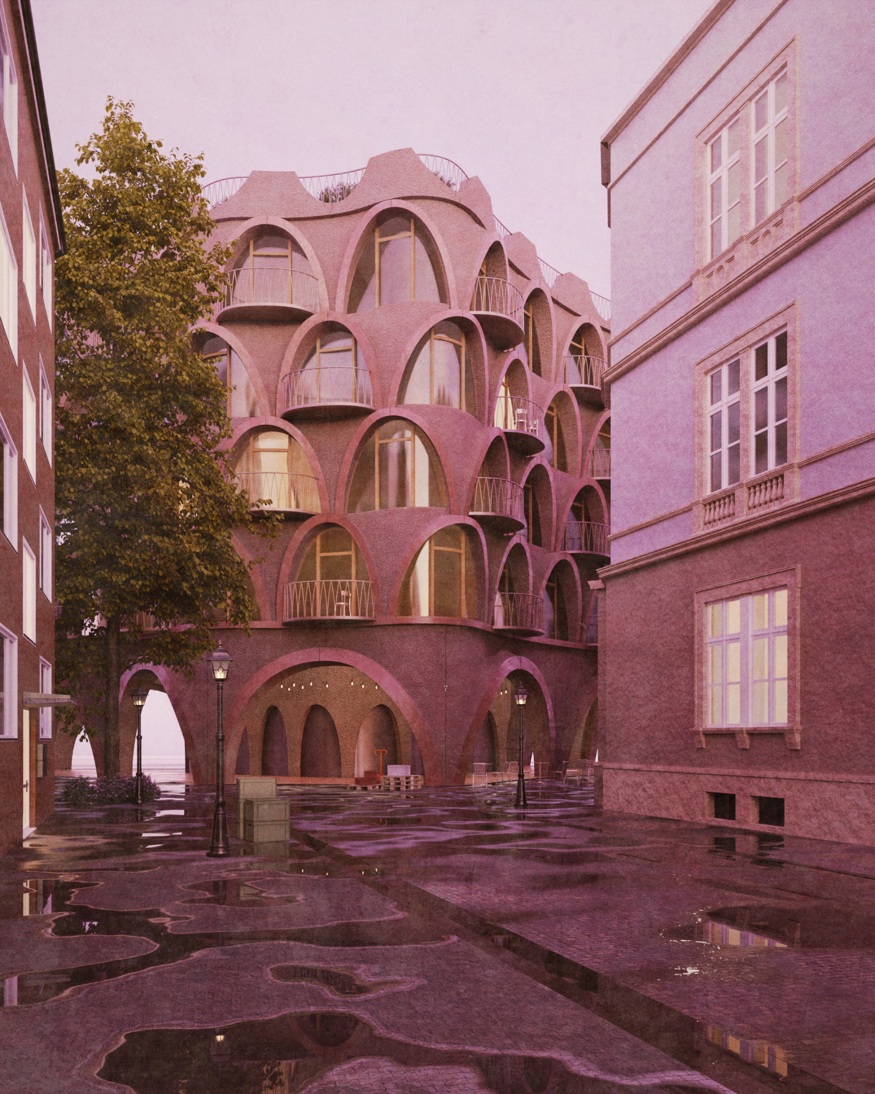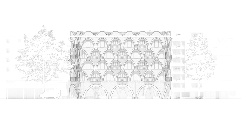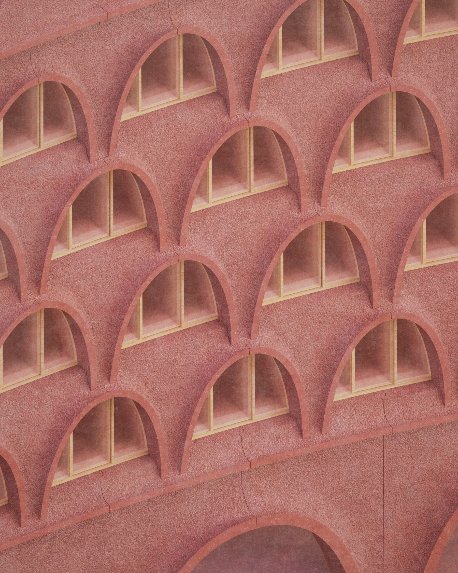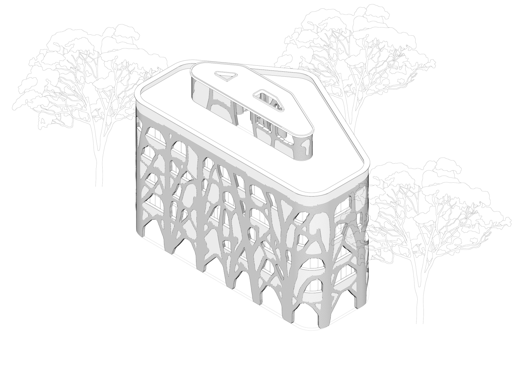The building design focusses on resource optimized elements with a minimized usage of reinforcement by reducing most of the static structure to compressive forces taken up by the arched, monolithic facade elements. The aim is to combine an aesthetic approach with the various formal possibilities of AM technologies whilst creating simple monolithic elements that house different functions such as orientation dependent shading, insulation and drainage.