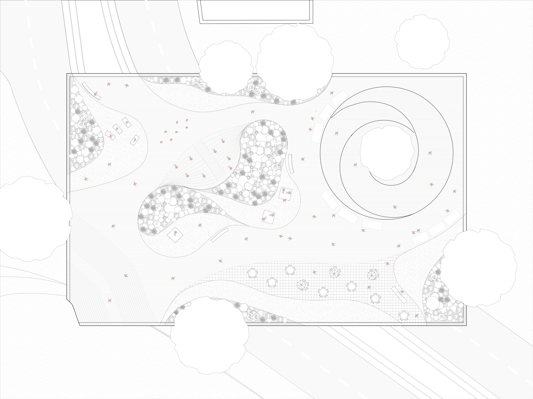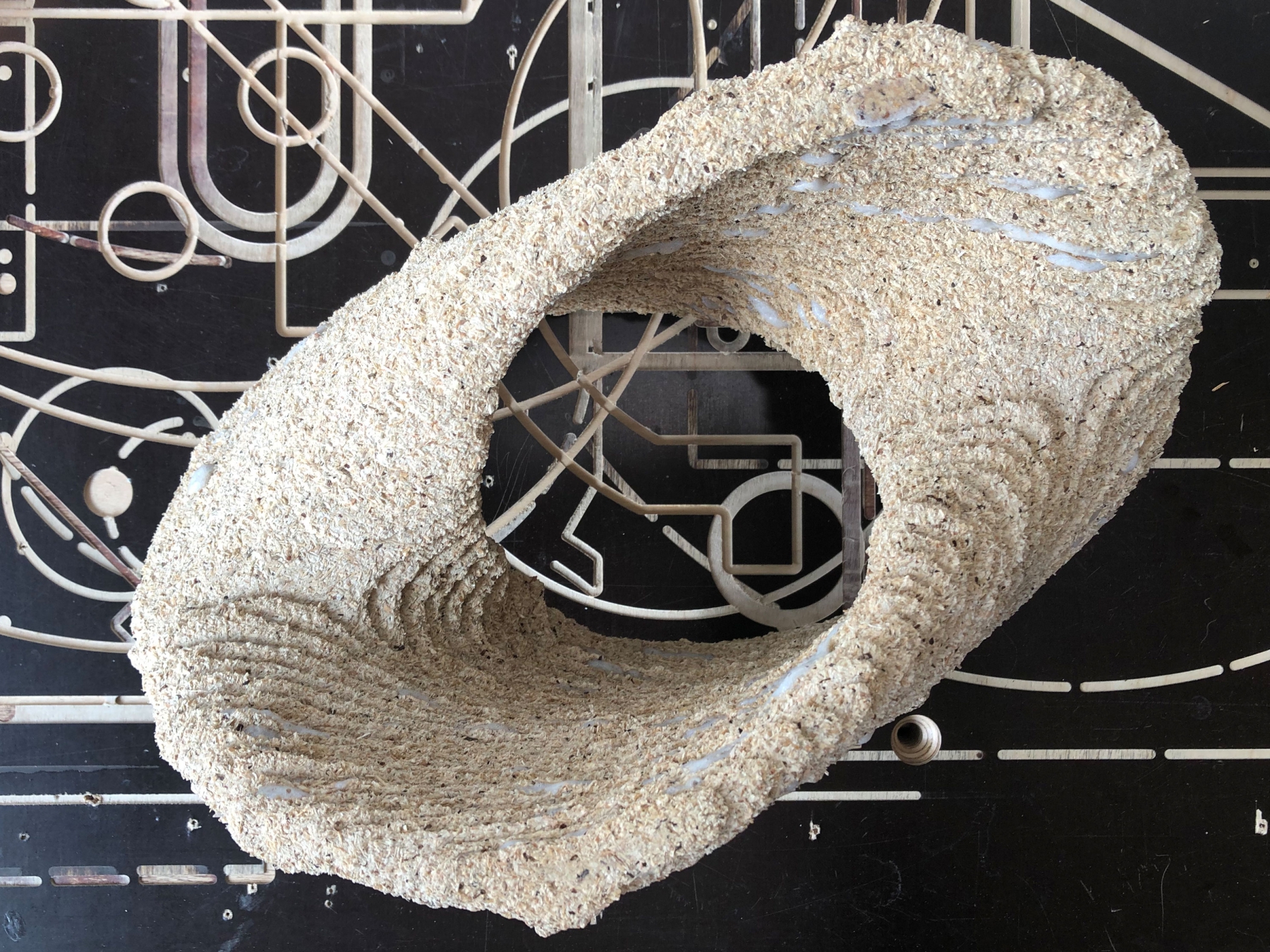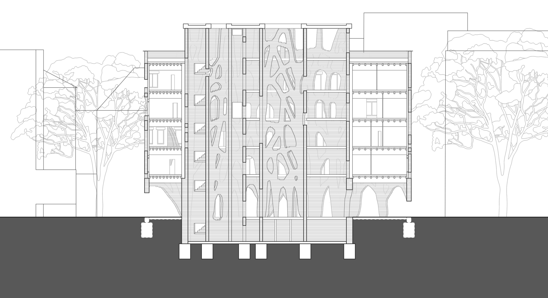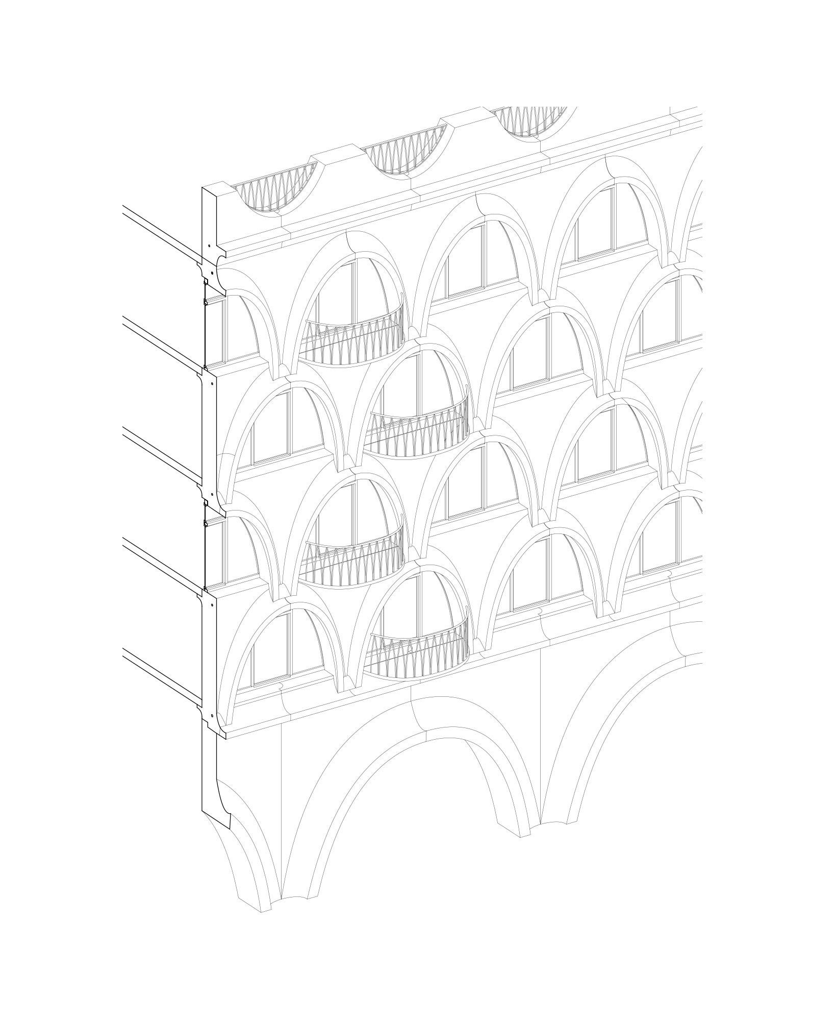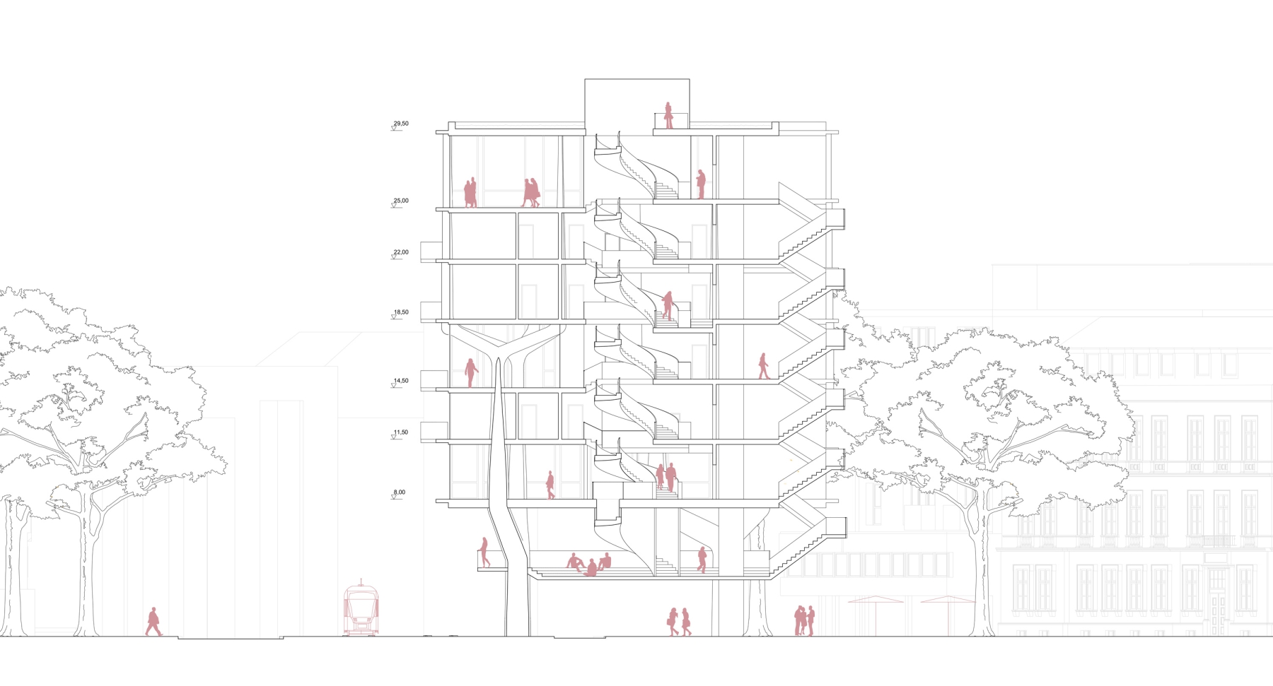 The building design focusses on resource optimized elements with a minimized usage of reinforcement by reducing most of the static structure to compressive forces taken up by the arched, monolithic facade elements. The aim is to combine an aesthetic approach with the various formal possibilities of AM technologies whilst creating simple monolithic elements that house different functions such as orientation dependent shading, insulation and drainage.