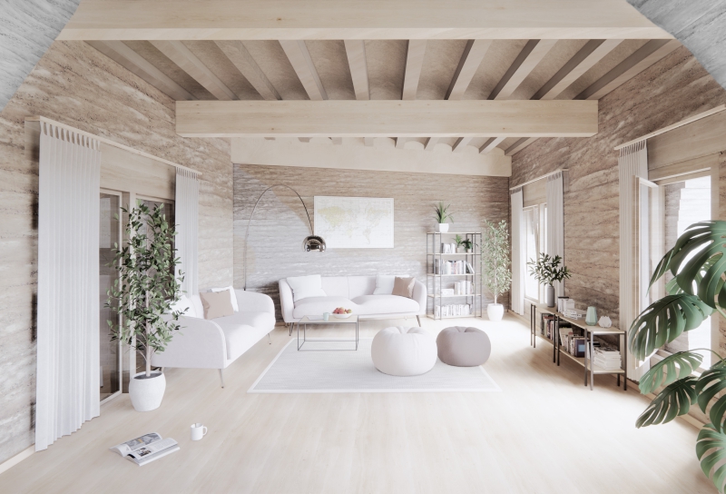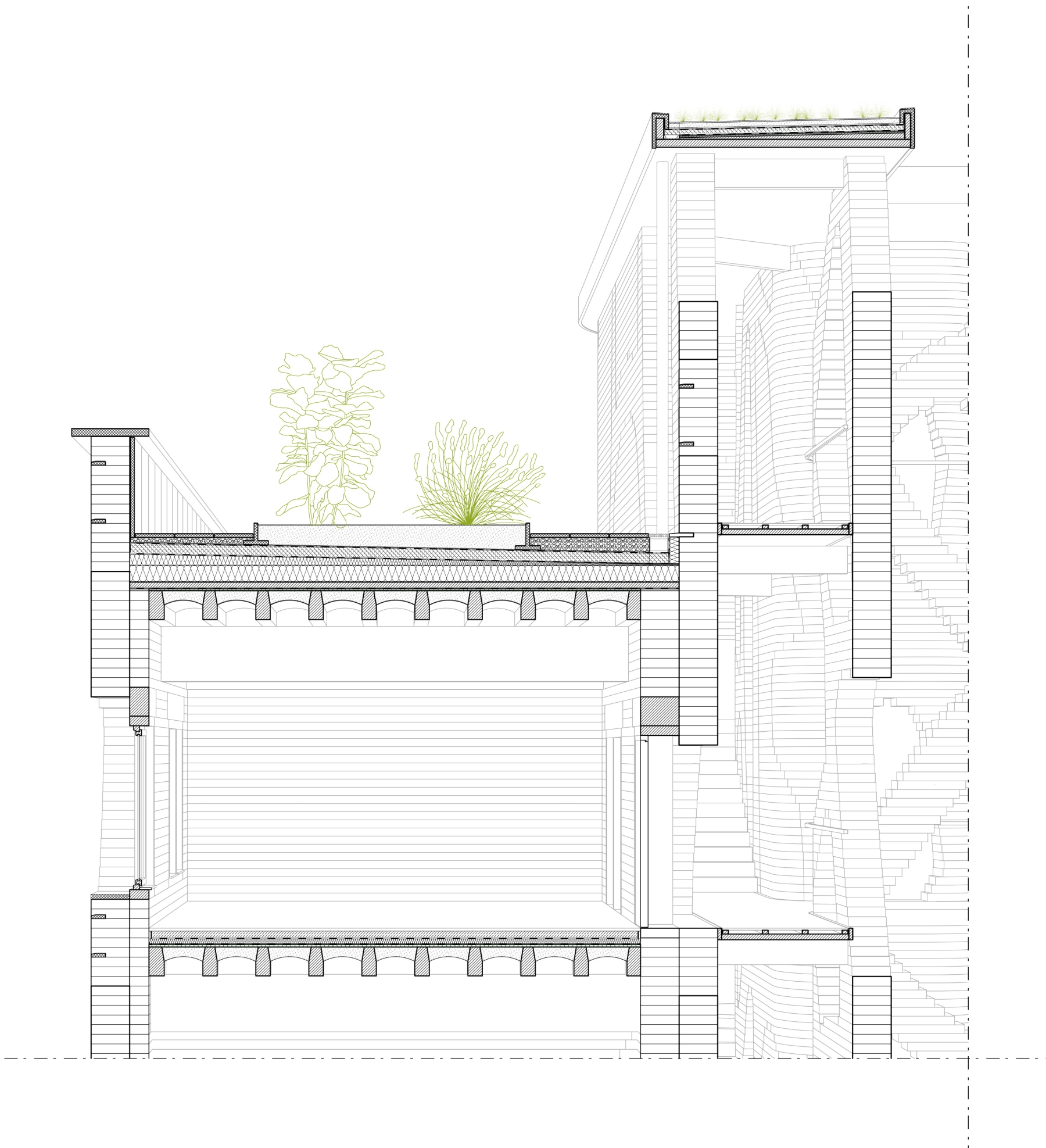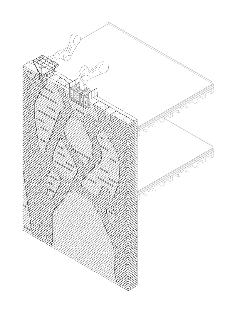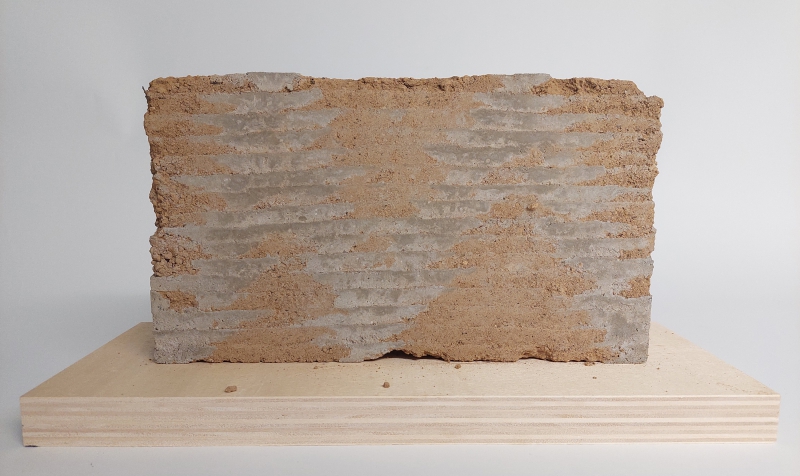 The building concept is based on the idea of a differentiated nozzle system which allows combining clay, concrete and lightweight clay in a robotic ramm process. Rammed clay provides the building shell and serves as formwork for integrated load bearing structures made of rammed concrete. On the interior side a layer of lightweigth clay is rammed simultaneously and provides the insulation of the building.