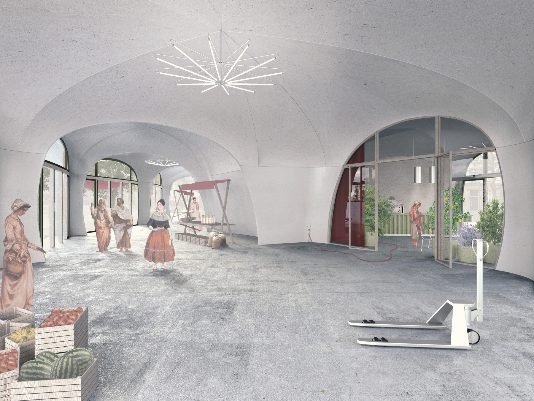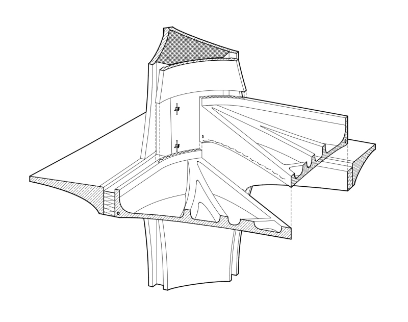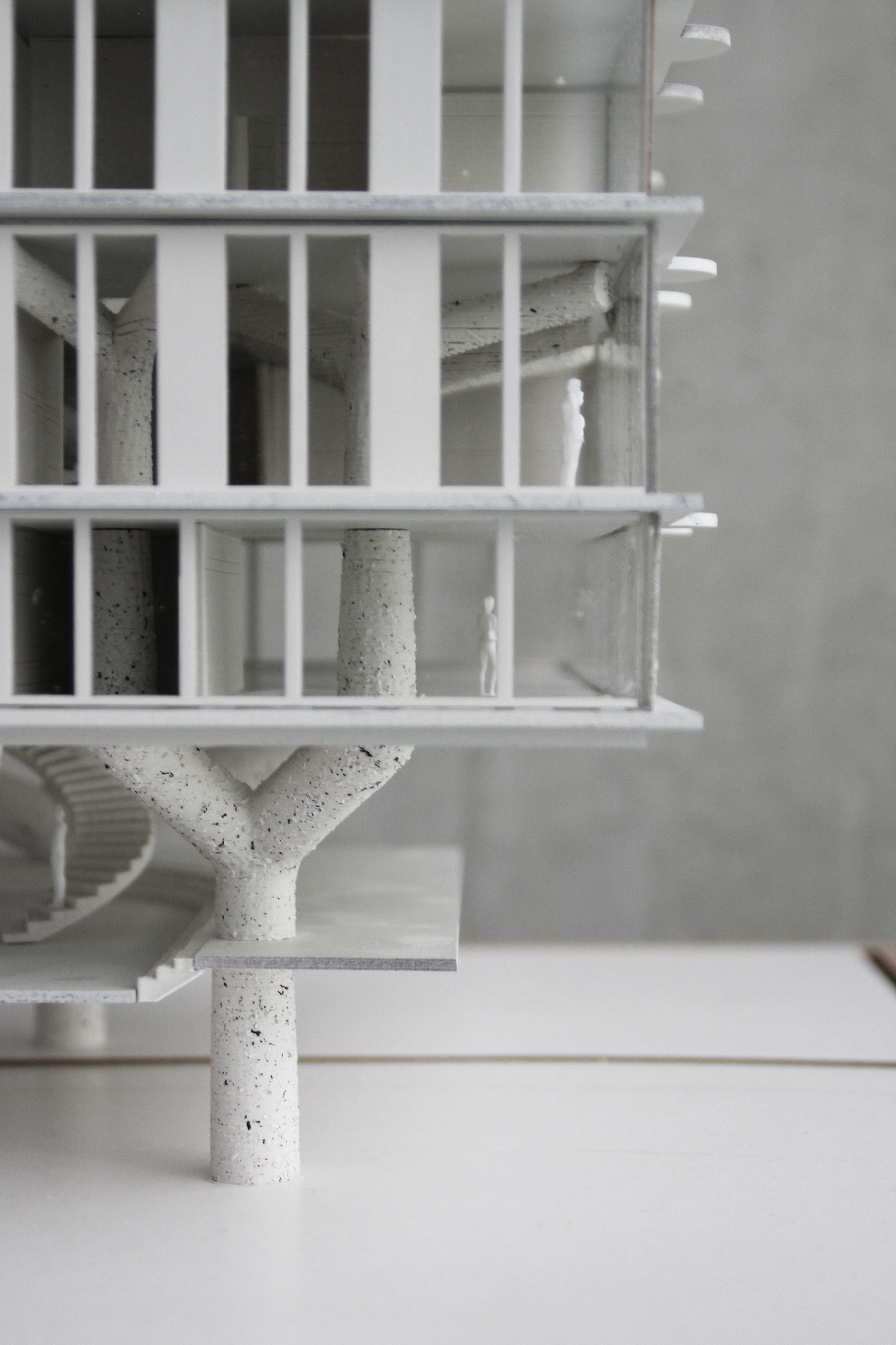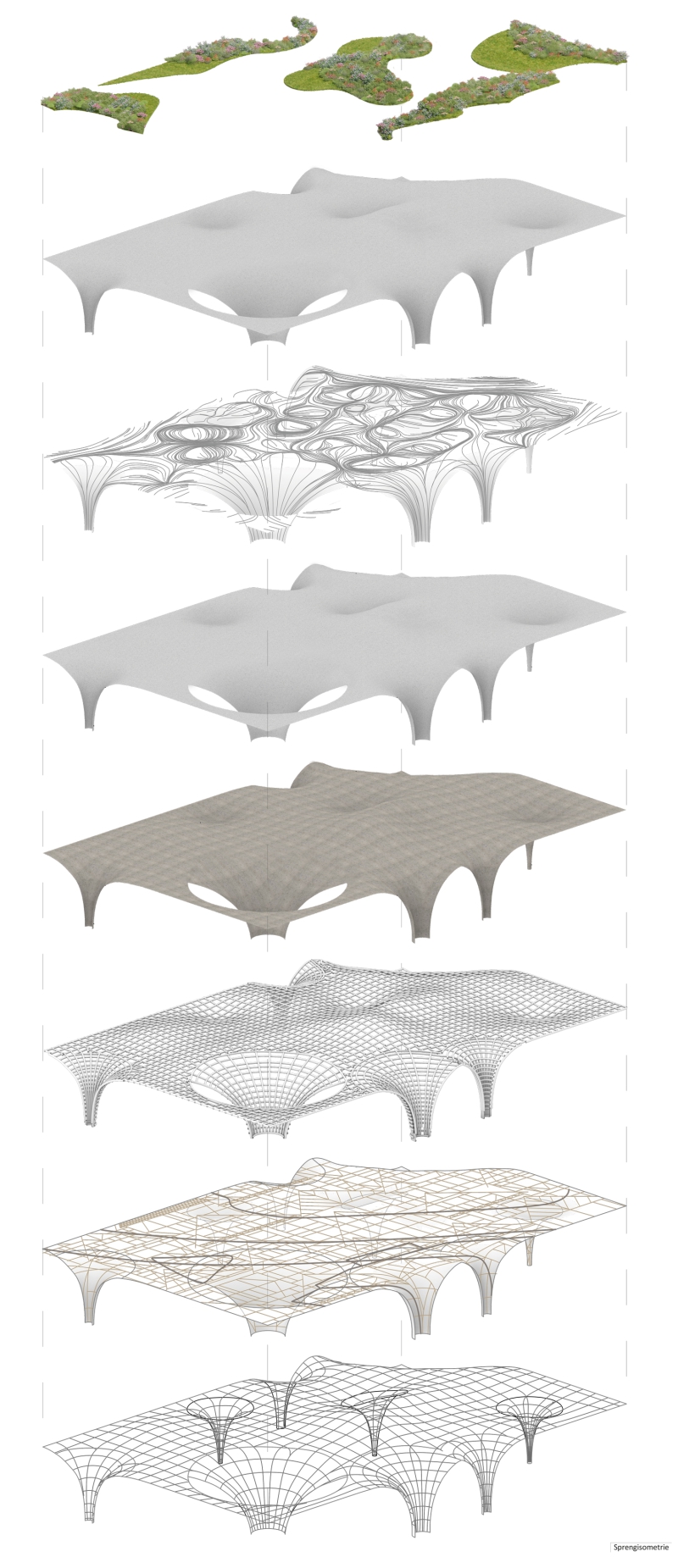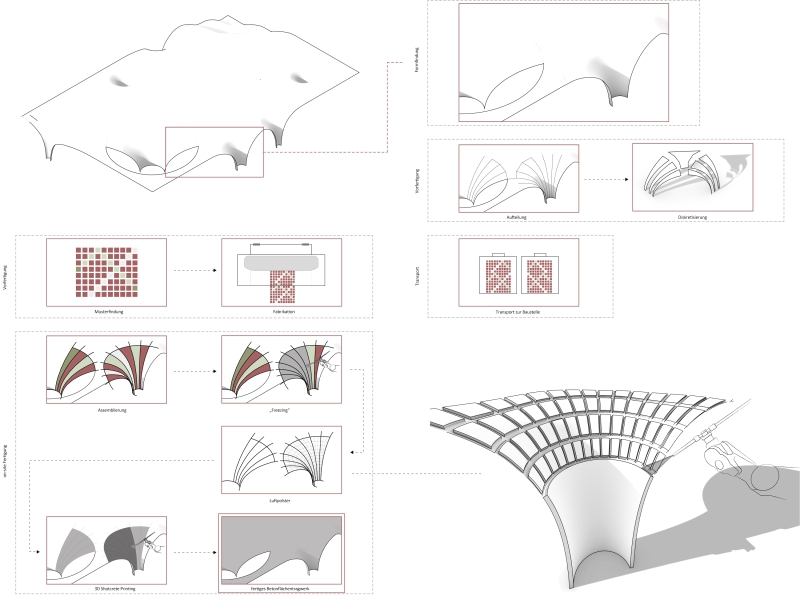 Starting point of our design proposal was the shell and its material-efficient way of transferring loads to the ground. Therefore we used vaulted ceilings and columns that consist of three shells that also brace themselves. The parts are prefabricated in a controlled environment and then assembled on site with dry joints, creating a super-light load-bearing structure. The plan is completely free for an unlimited number of configurations.