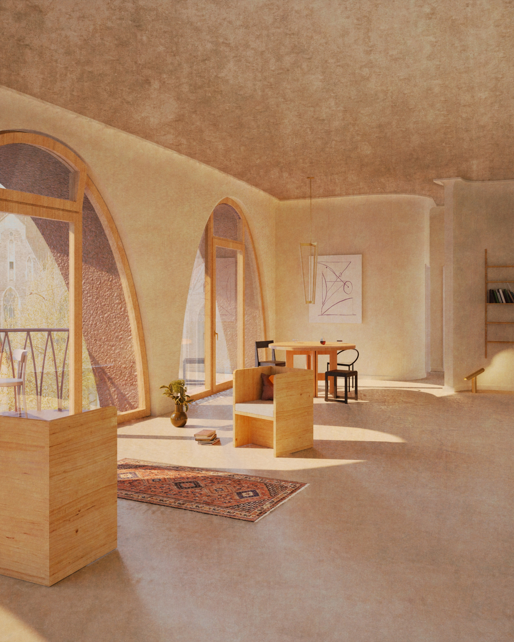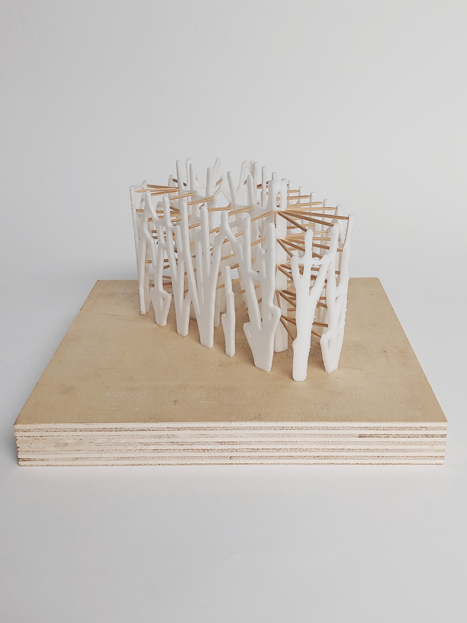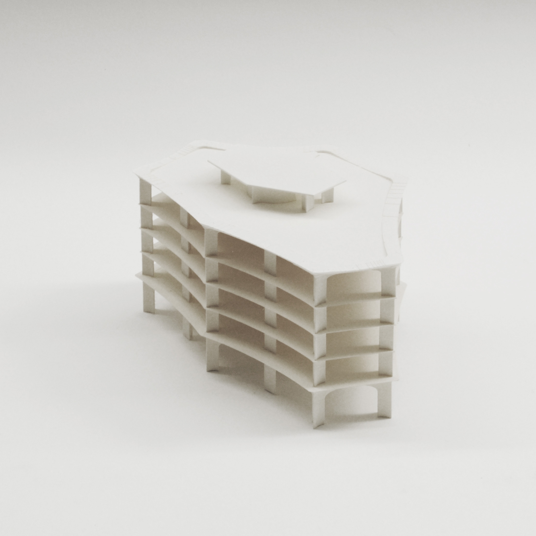 Starting point of our design proposal was the shell and its material-efficient way of transferring loads to the ground. Therefore we used vaulted ceilings and columns that consist of three shells that also brace themselves. The parts are prefabricated in a controlled environment and then assembled on site with dry joints, creating a super-light load-bearing structure. The plan is completely free for an unlimited number of configurations.