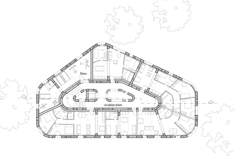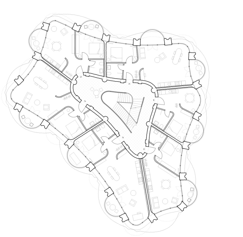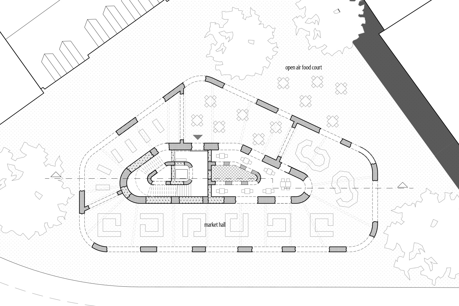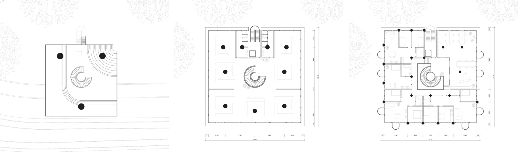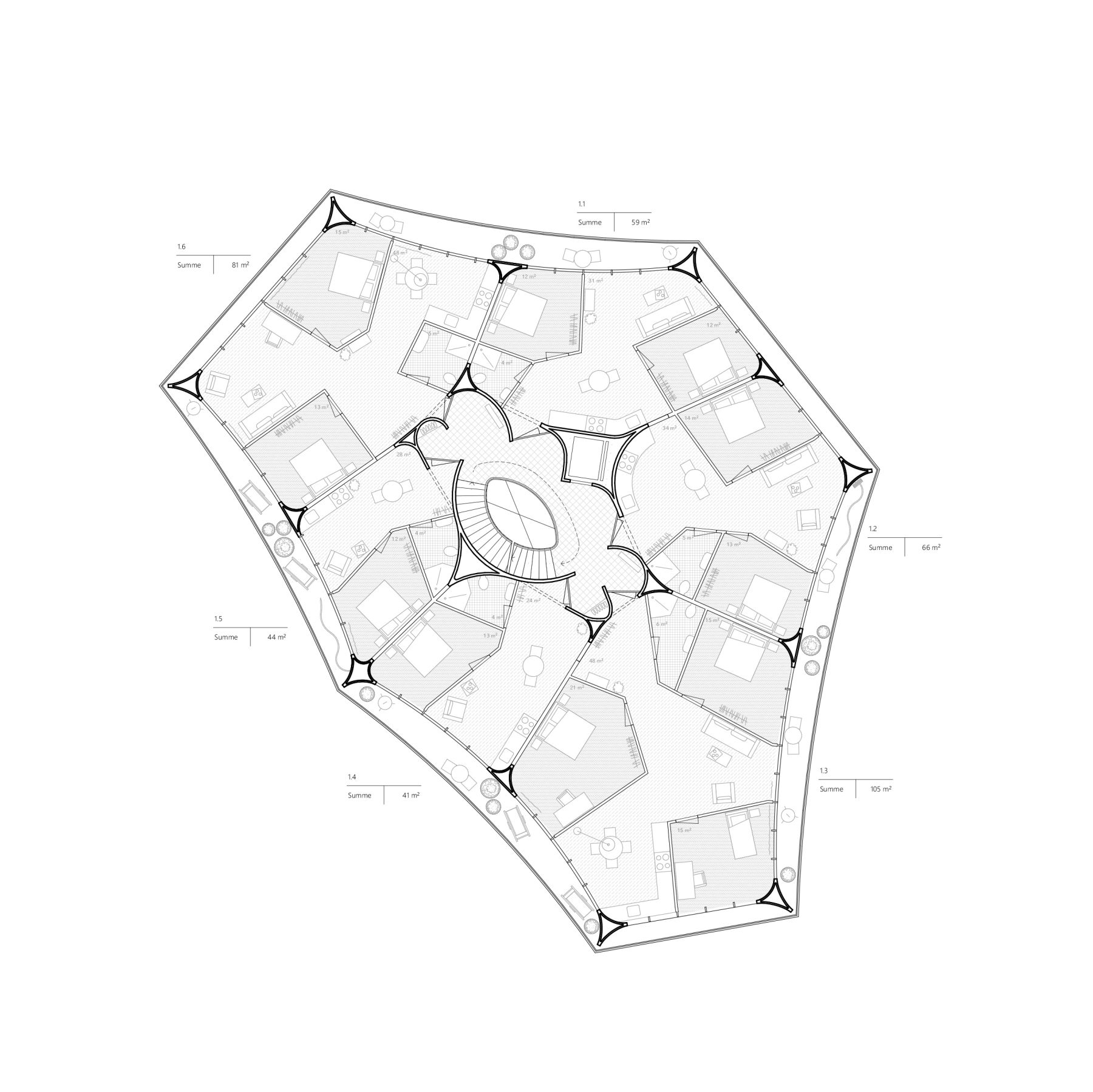 Starting point of our design proposal was the shell and its material-efficient way of transferring loads to the ground. Therefore we used vaulted ceilings and columns that consist of three shells that also brace themselves. The parts are prefabricated in a controlled environment and then assembled on site with dry joints, creating a super-light load-bearing structure. The plan is completely free for an unlimited number of configurations.