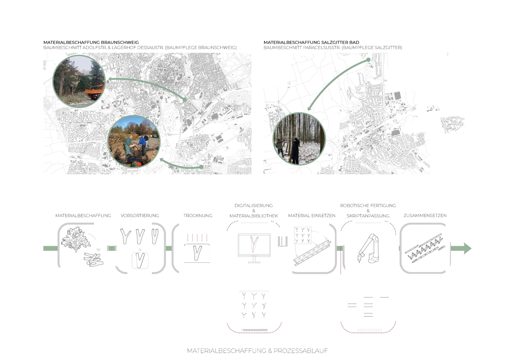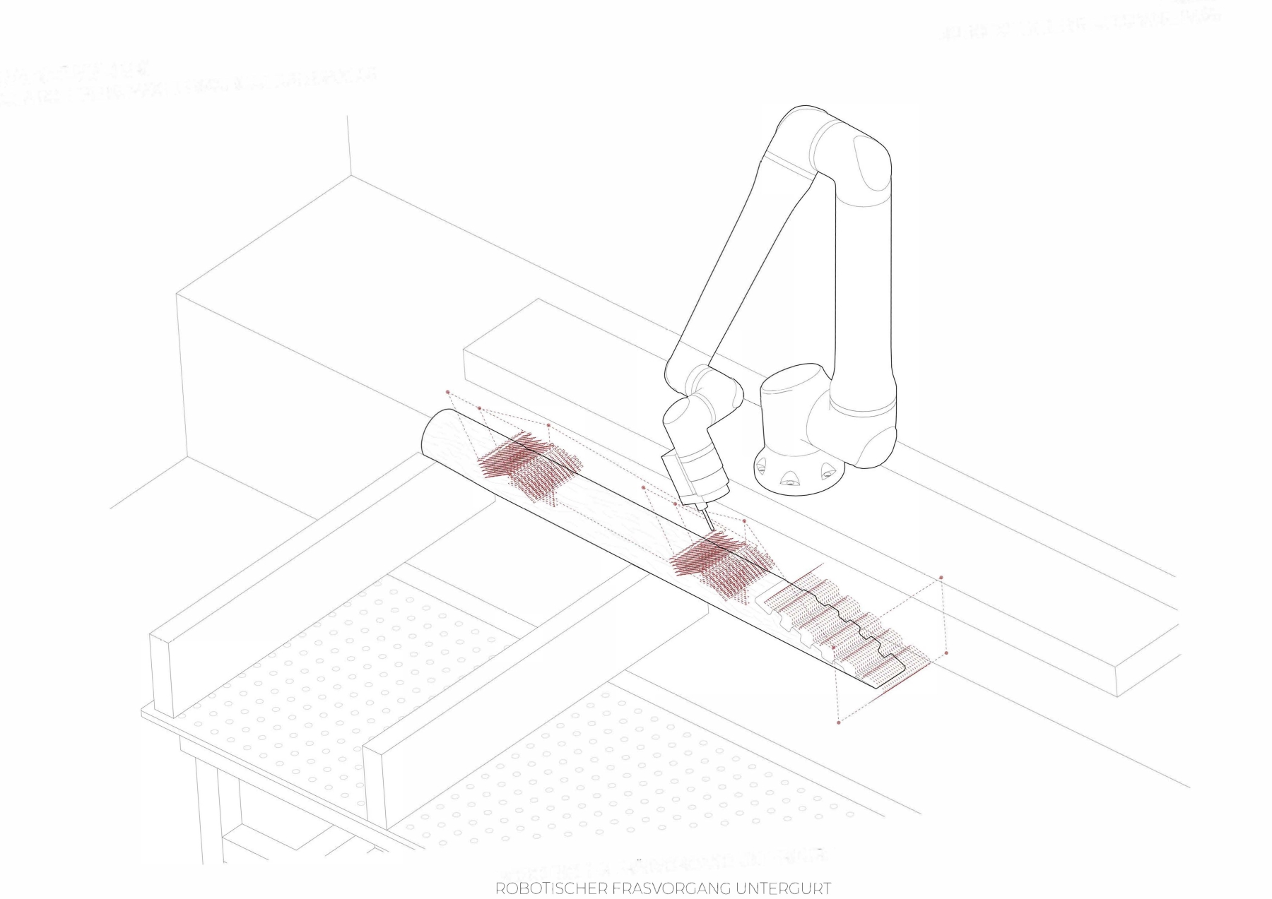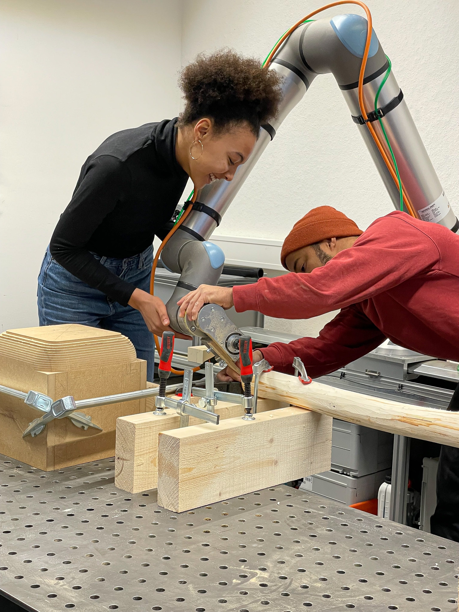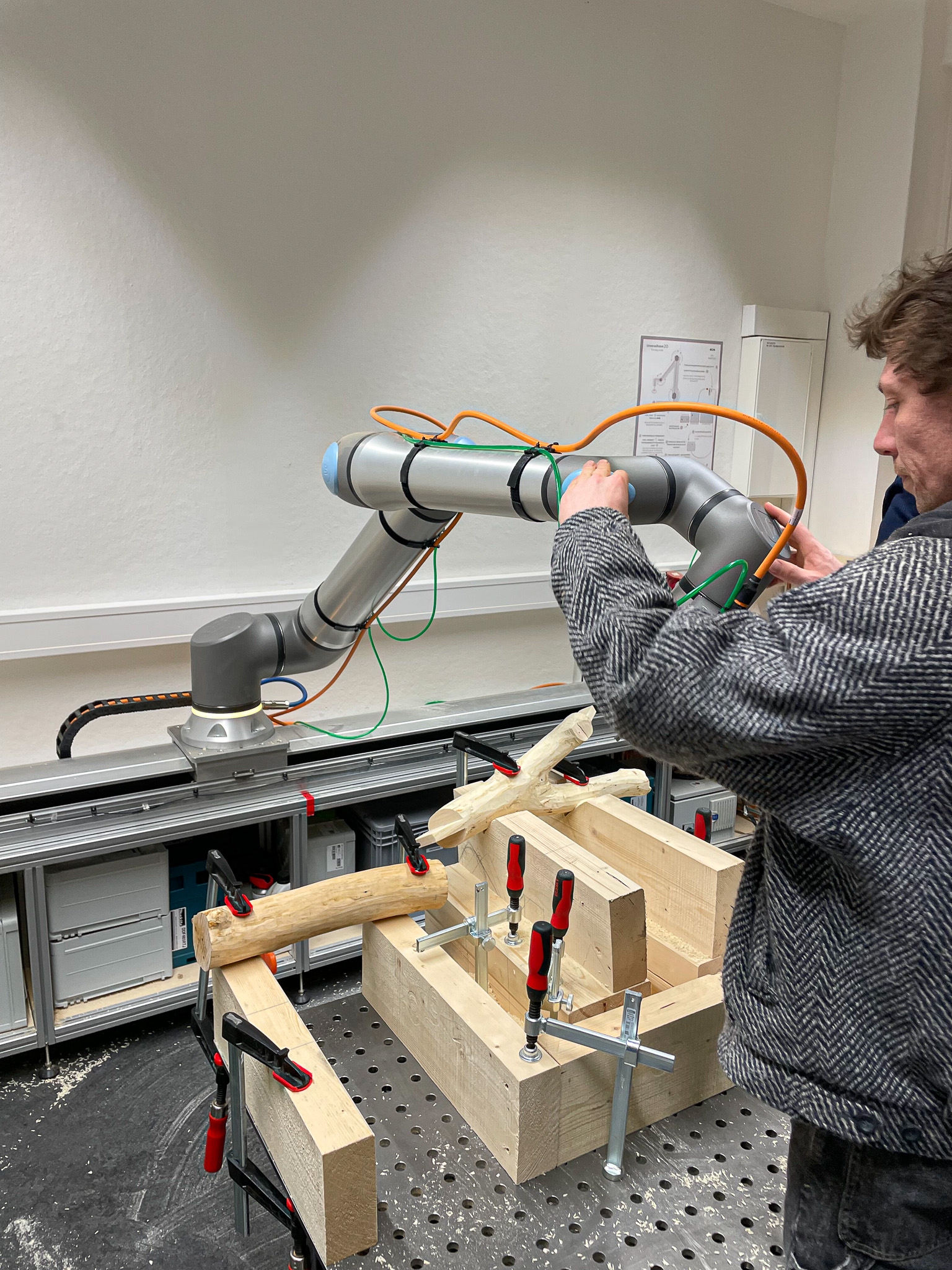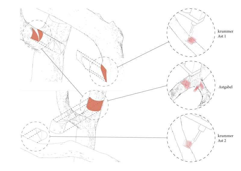 Im Entwurfskurs Robotic Timber Studio setzen wir uns mit der Anwendung von digitalen Planungs- und Fertigungsmethoden im Holzbau auseinander. Wir untersuchen die Potenziale digitaler Technologien bei der Entwicklung nachhaltiger Konzepte für die Bauwende und der Etablierung einer neuen architektonischen Sprache. Der Schwerpunkt des Semesters liegt auf dem praxisnahen Arbeiten mit dem Roboter und dem konstruktiven Experiment. Ziel des Kurses ist es in einem forschenden Ansatz Ideen und Konzepte in ein reales konstruktives Projekt zu überführen. Wie verändern digitale Werkzeuge das Handwerk und können Architektinnen zu digitalen Handwerkerinnen werden? Welches Wissen ist dafür notwendig und wie können wir durch forschendes Lernen unsere Umwelten genauer betrachten und transformieren?