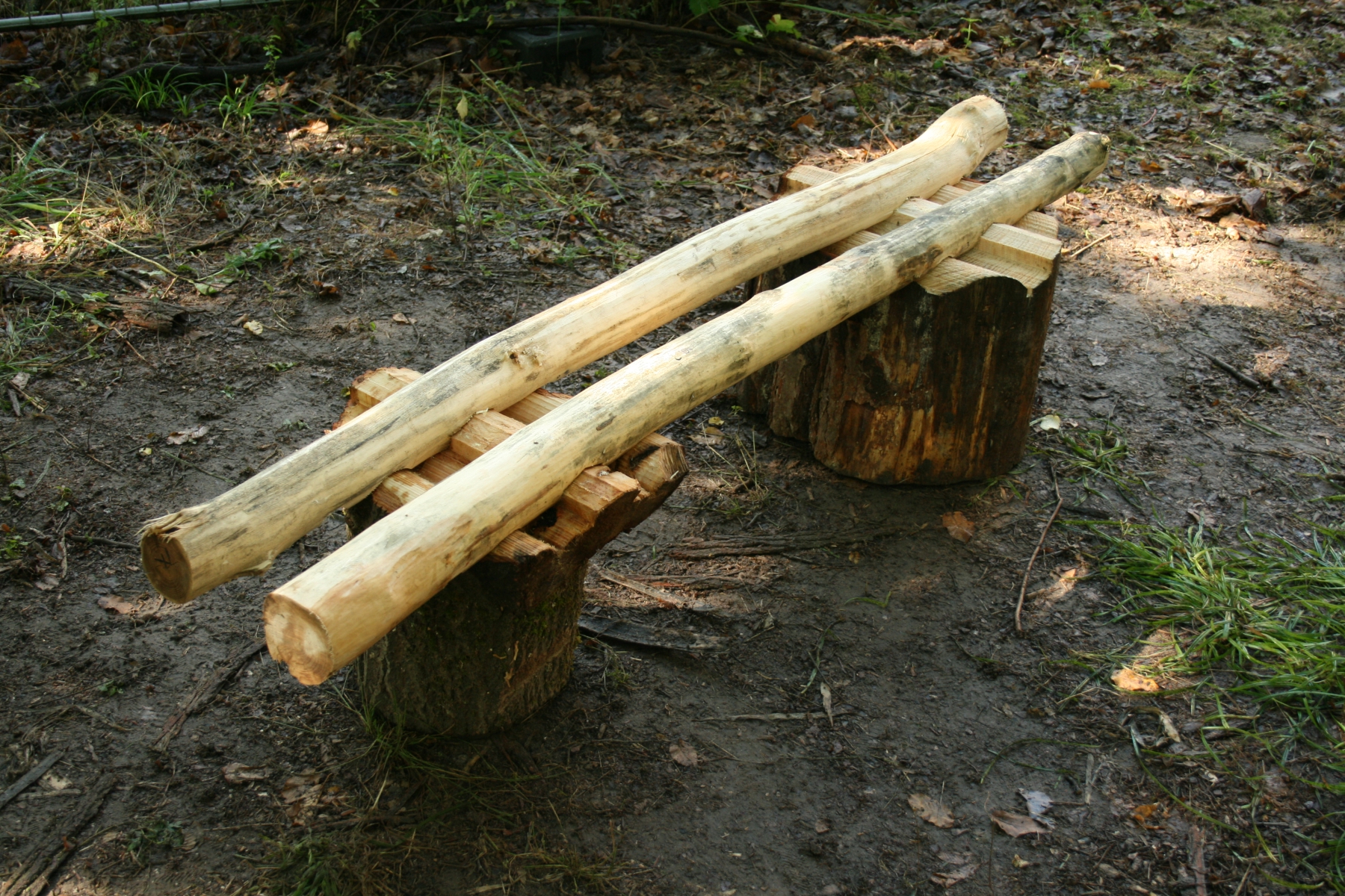 Die Bank besteht aus zwei Baumstümpfen und zwei Ästen. Das verwendete Material ist bewusst schlicht und unbehandelt, die Verbindung jedoch präzise gearbeitet. Eine schwalbenschwanzähnliche Fräsung verhindert, dass sich die Äste von den Stümpfen lösen. Die Konstruktion ist modular erweiterbar und lässt sich verlängern. Durch ihr Gewicht und die feste Verbindung wirkt sie beinahe wie ein fest verankertes Möbelstück, schwer beweglich und dauerhaft verankert.