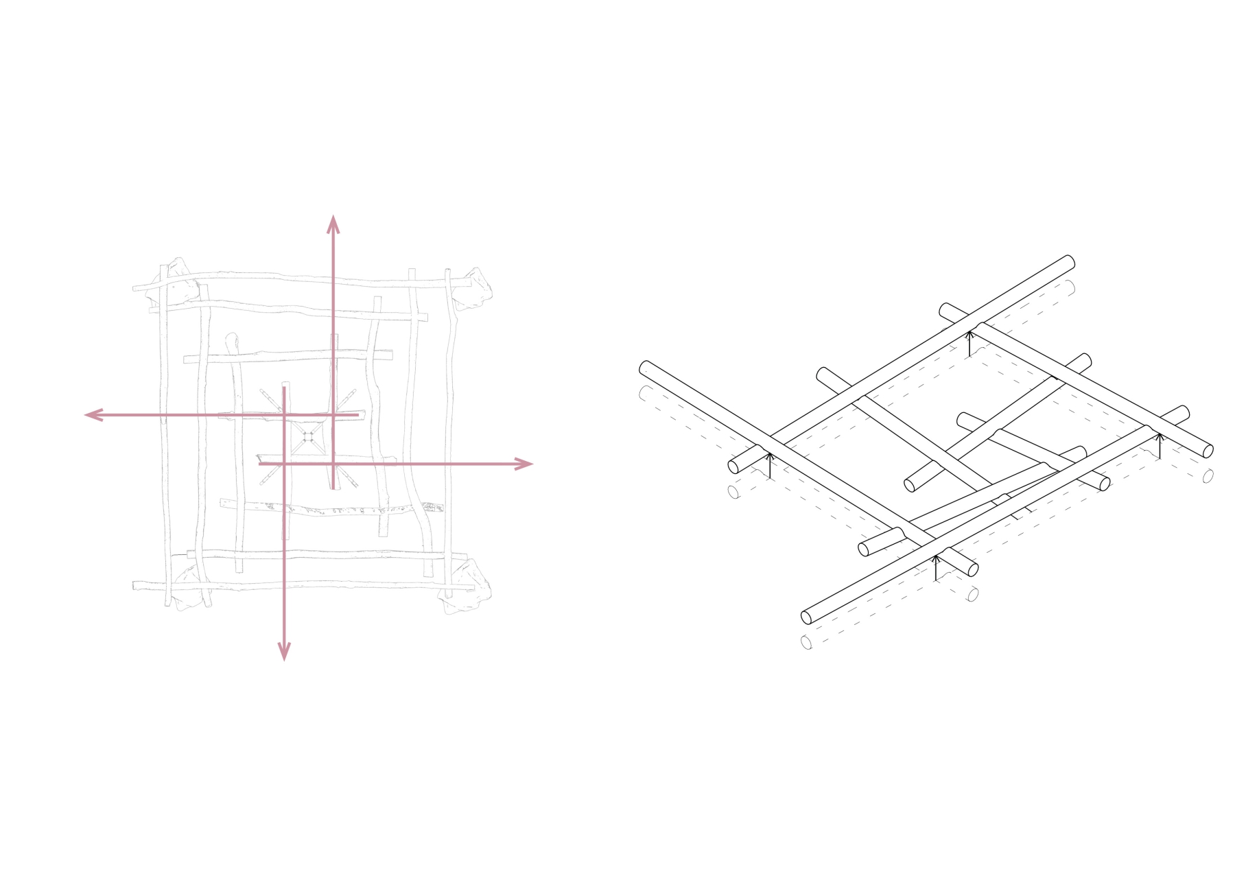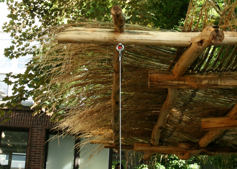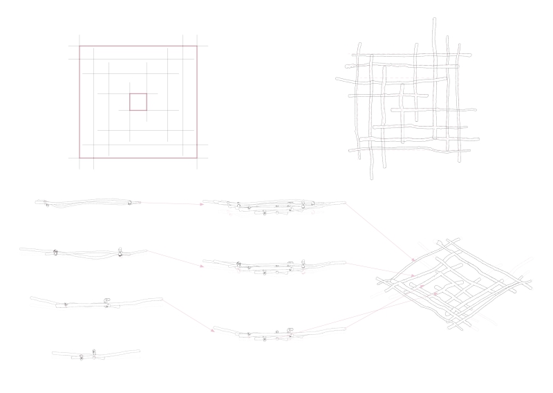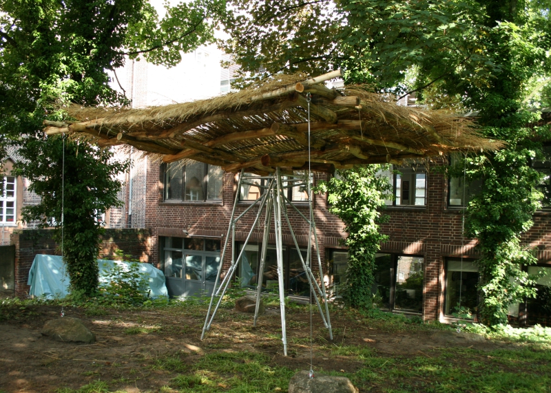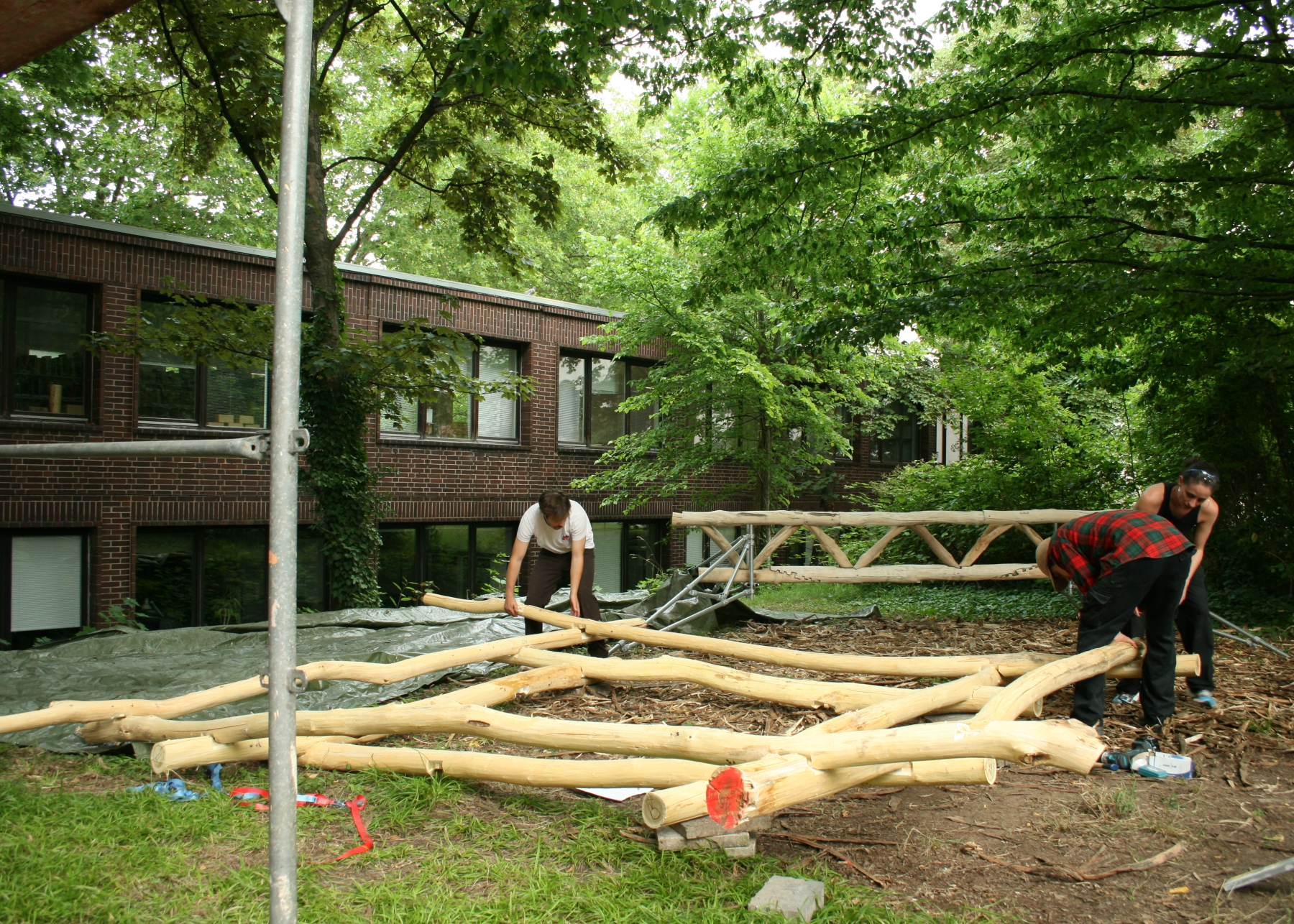 Die Dachfläche orientiert sich an der Baumreihe zwischen Gebäude und Parkplatz und erweitert den Eingangsbereich zu einem Aufenthaltsraum. Drei Module werden an Bäumen aufgehängt und kommen ohne Stützen aus. Jedes Modul besteht aus vier übereinanderliegenden Rahmen, deren reziprokes Konstruktionsprinzip eine effiziente Flächenbildung mit minimalem Holzeinsatz ermöglicht. Stahlseile steifen den oberen Rahmen aus und verbinden die Module zu einer zusammenhängenden Dachfläche.