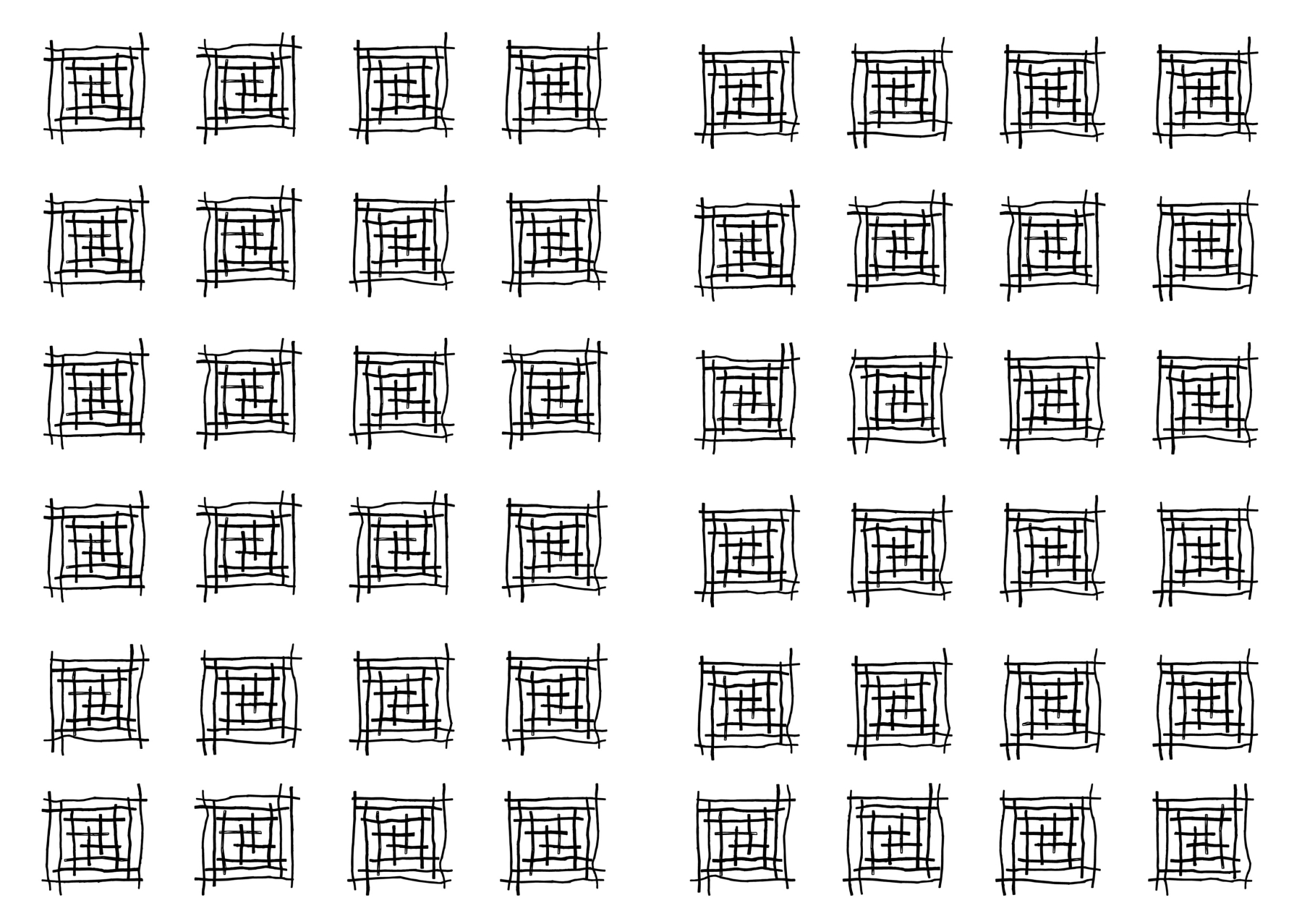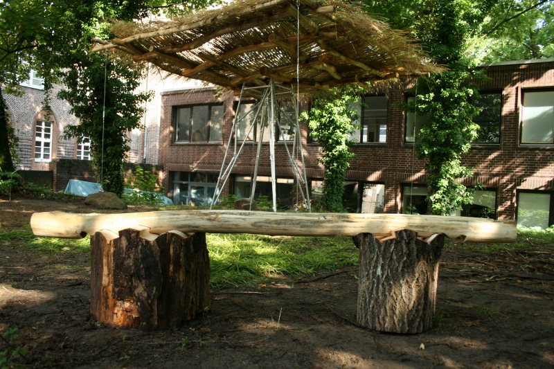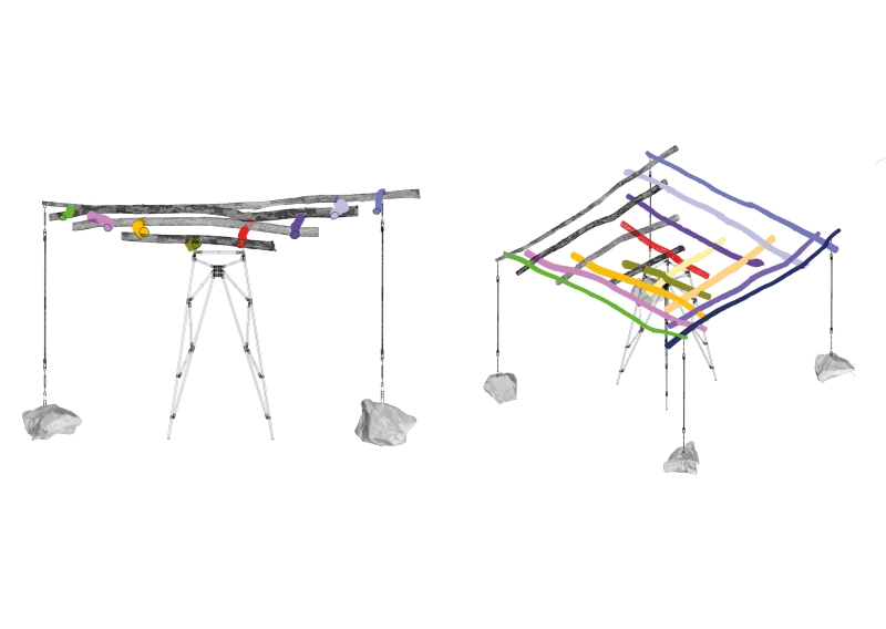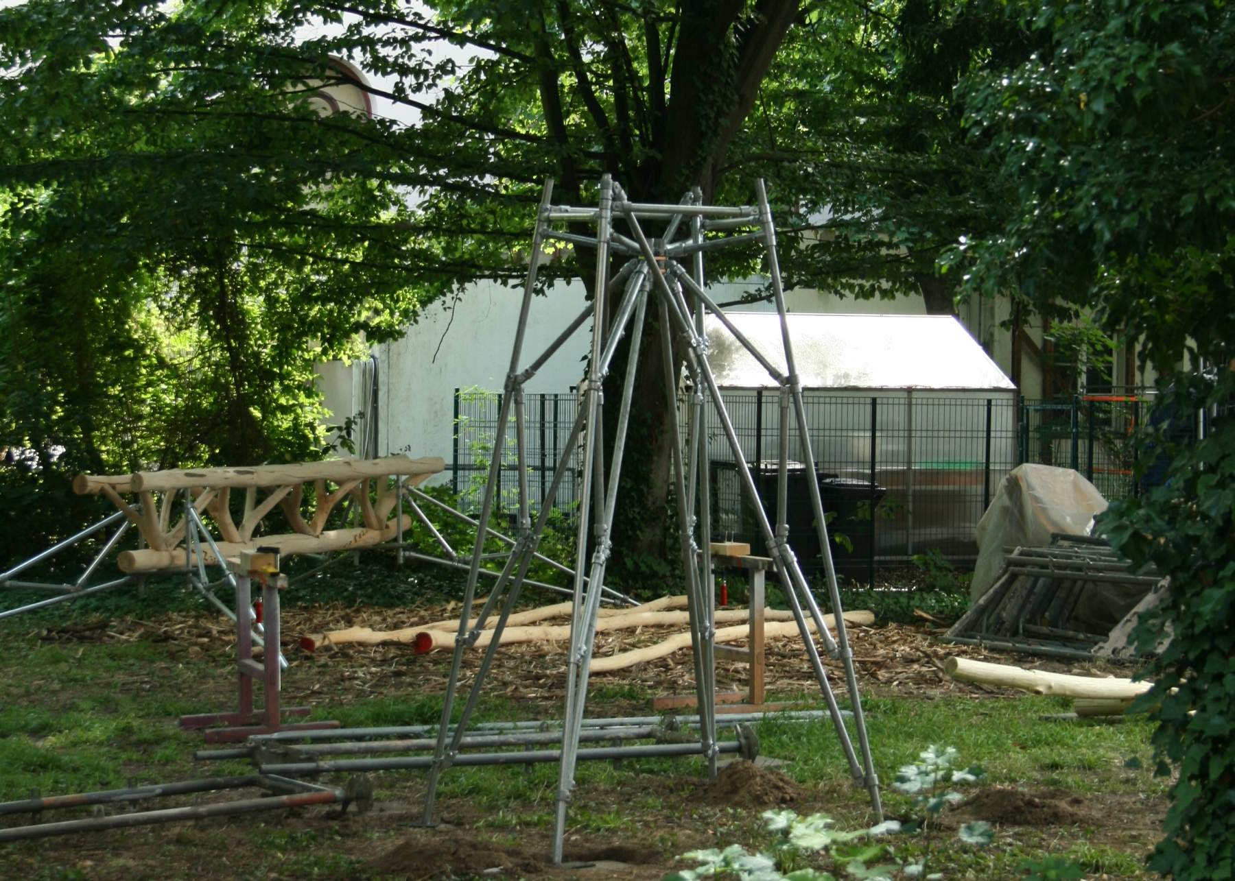 Die Dachfläche orientiert sich an der Baumreihe zwischen Gebäude und Parkplatz und erweitert den Eingangsbereich zu einem Aufenthaltsraum. Drei Module werden an Bäumen aufgehängt und kommen ohne Stützen aus. Jedes Modul besteht aus vier übereinanderliegenden Rahmen, deren reziprokes Konstruktionsprinzip eine effiziente Flächenbildung mit minimalem Holzeinsatz ermöglicht. Stahlseile steifen den oberen Rahmen aus und verbinden die Module zu einer zusammenhängenden Dachfläche.