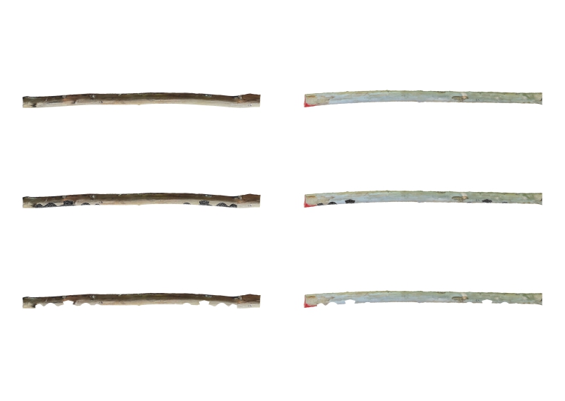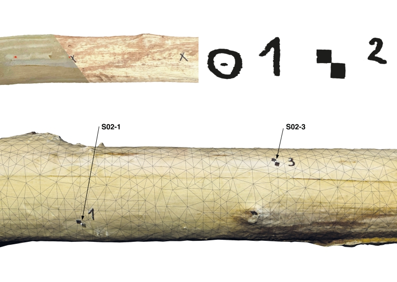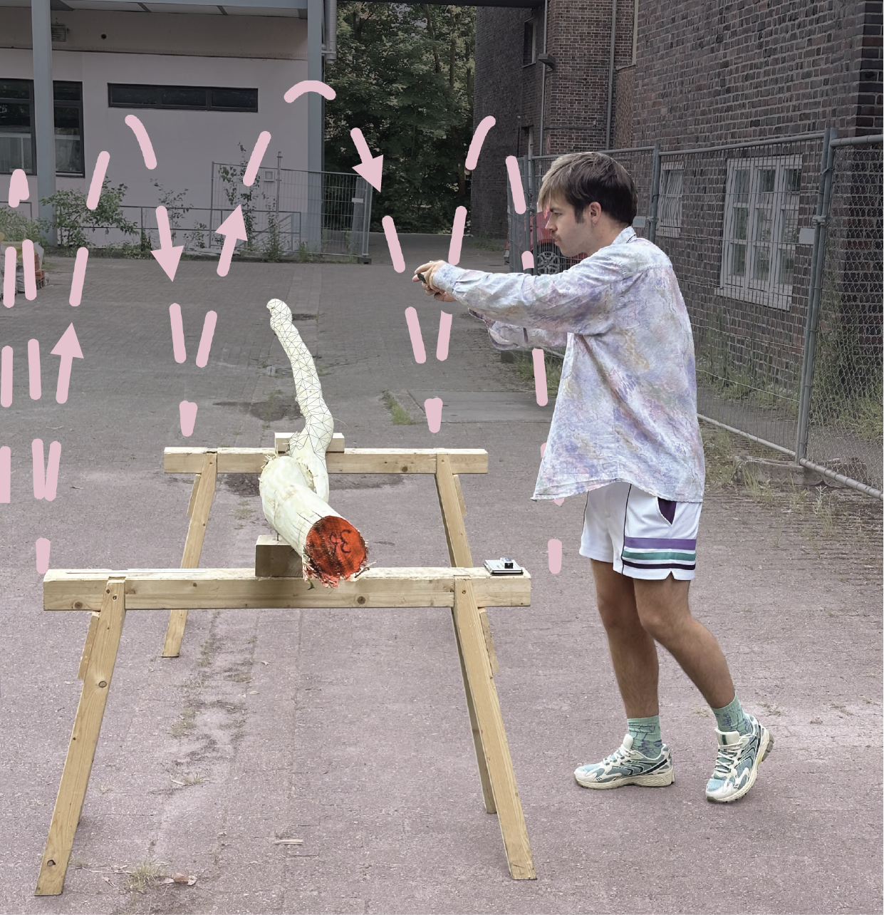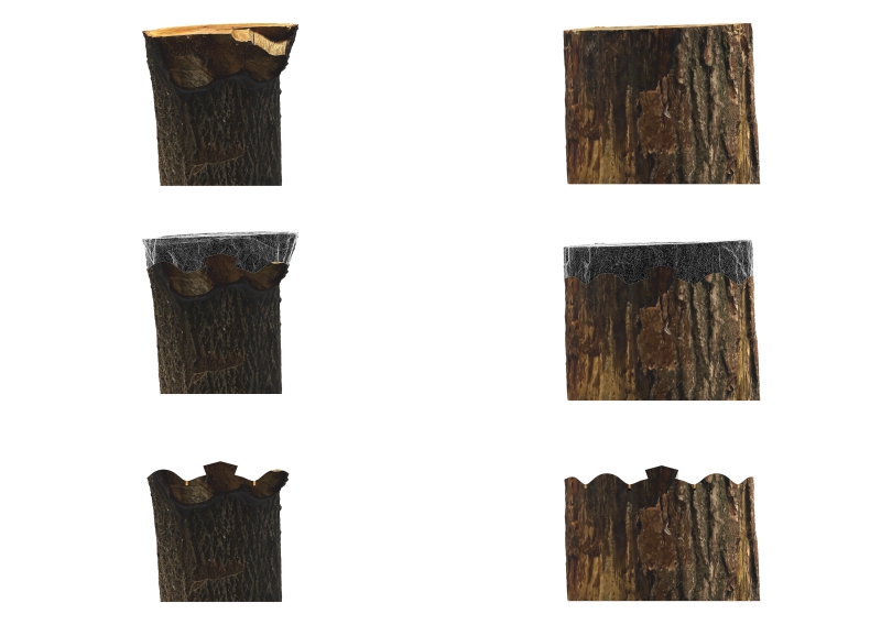 2. Auflagern der Stämme auf Holzböcke mit zusätzlich kleinen Holzblöcken als punktuelle Auflage zum besseren Fotografieren.