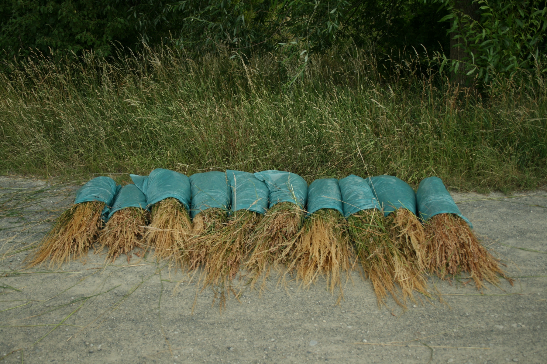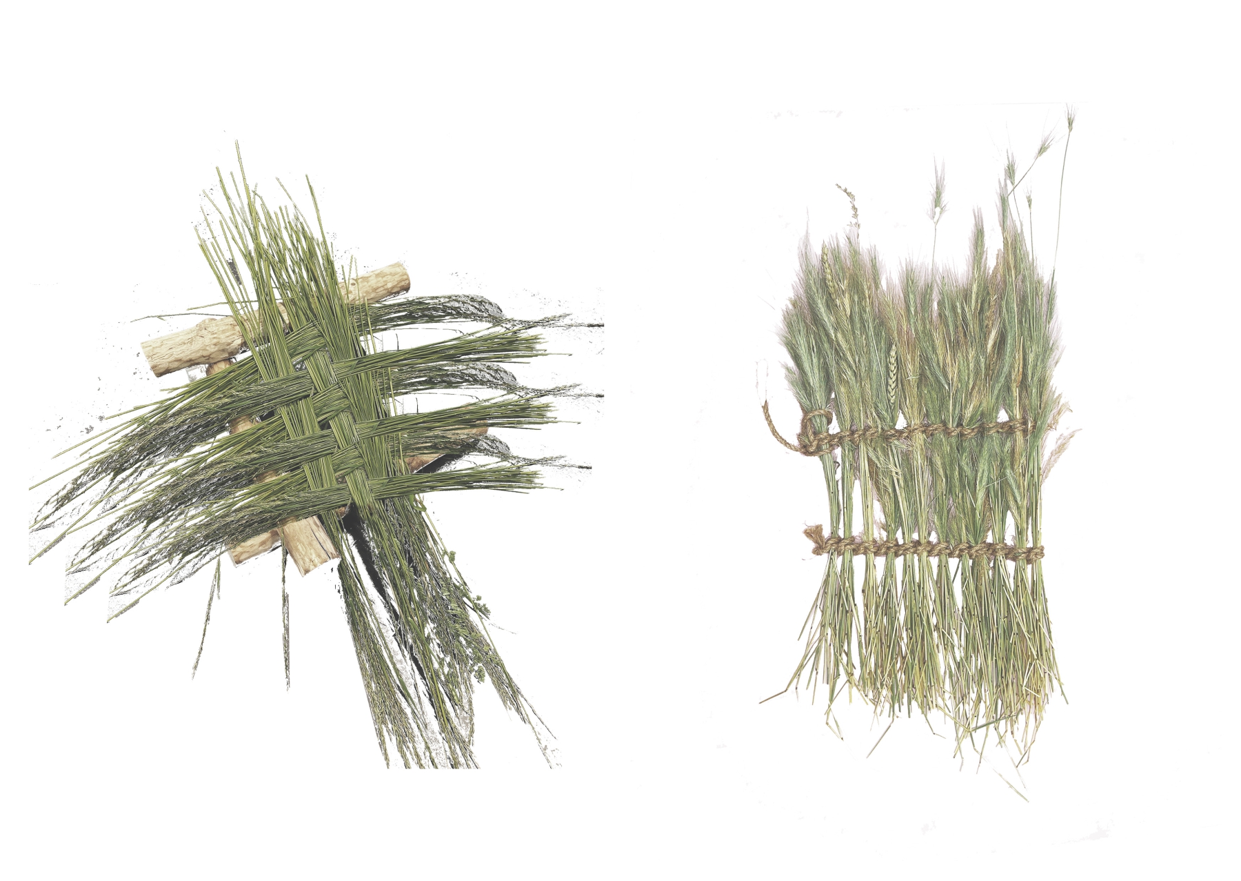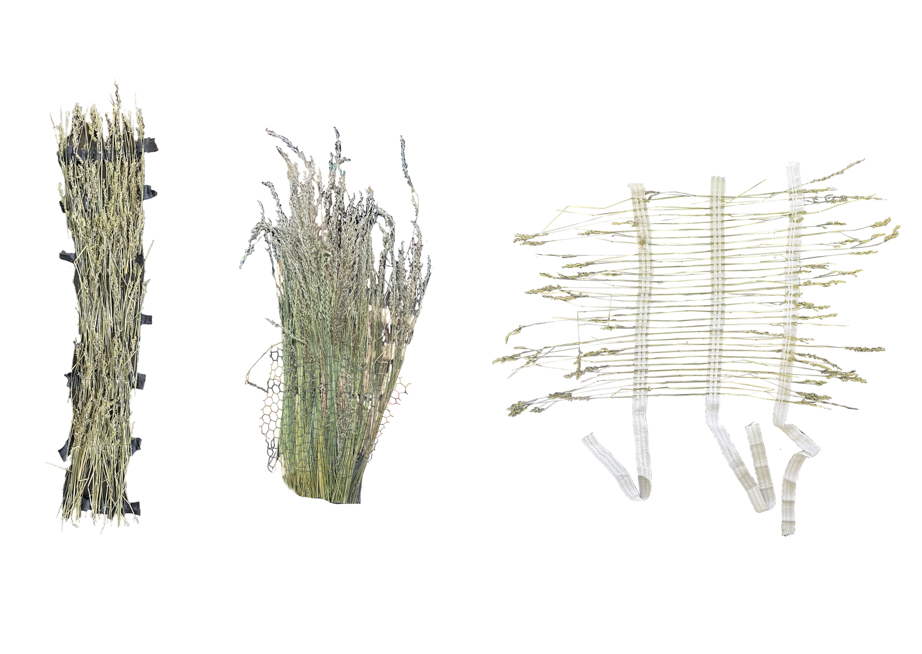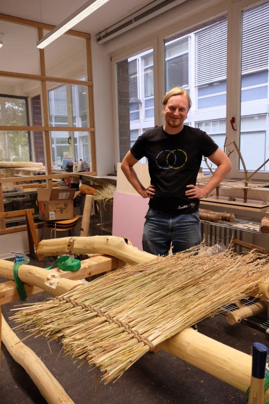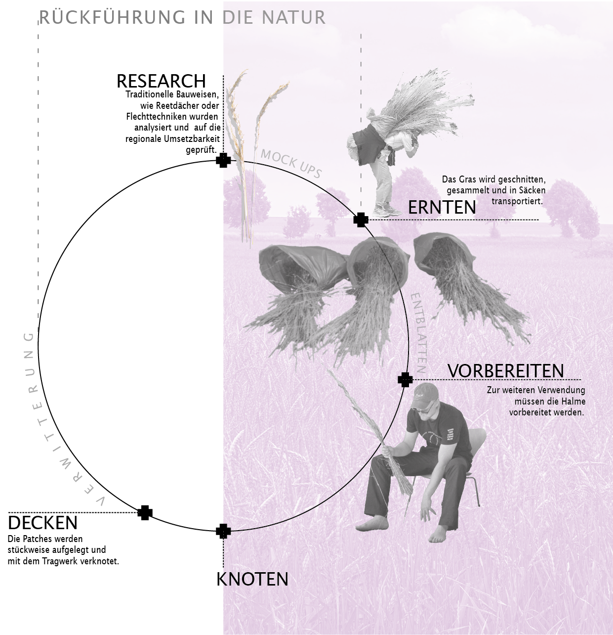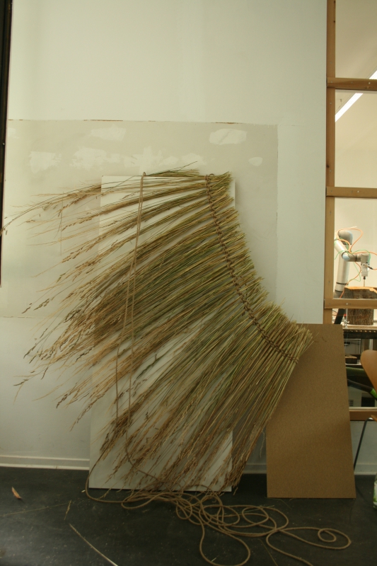 Die Dachhaut bildet den handwerklichen Gegenpol zur digital gefertigten Tragstruktur. Während die reziproke Tragstruktur Präzision durch robotische Unterstützung sucht, entstand das Dach bewusst aus rein manuellen Prozessen – vom Ernten über das Trocknen bis zum Flechten. Ziel war eine leichte, durchlässige und flexible Überdachung, die sich dem gewundenen Aufbau anpasst und zugleich die darunterliegende Konstruktion sichtbar lässt.