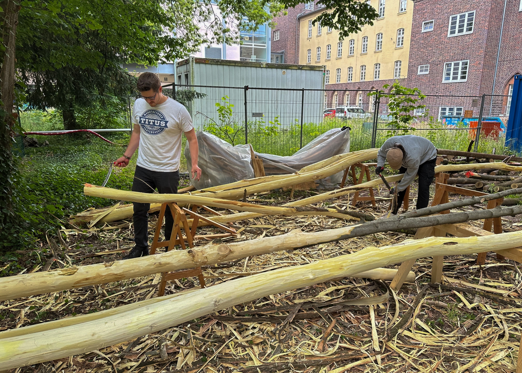1. Entrinden: Rinde durchfeuchten, damit sie sich leichter vom Holz lösen lässt. Mit einem Ziehmesser in langen, gleichmäßigen Zügen abziehen.