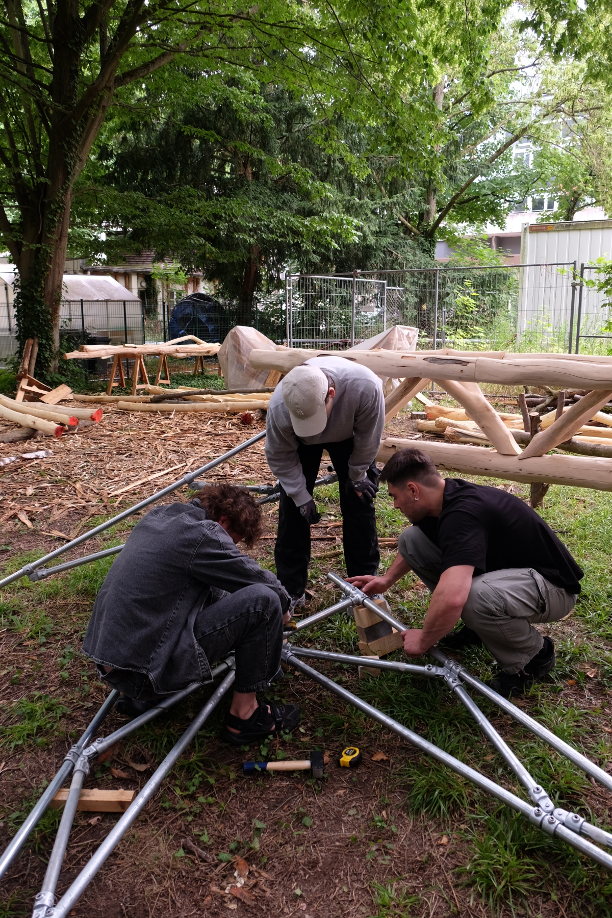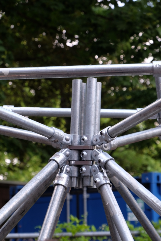 Die Unterkonstruktion des Daches besteht aus verzinkten Stahlrohren (Ø33mm), die mit Gussstahlverbindern mit Madenschrauben verbunden wurden. Die Bauteile stammen aus dem Buildify-System von Hornbach. Ähnlich wie das Dach, das es trägt, ist das Gerüst eine experimentelle Konstruktion, die während des Bauprozesses mehrfach geändert und ergänzt wurde, um den statischen und ästhetischen Anforderungen gerecht zu werden.